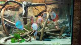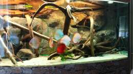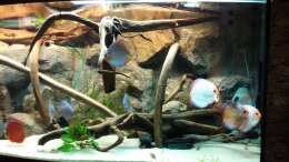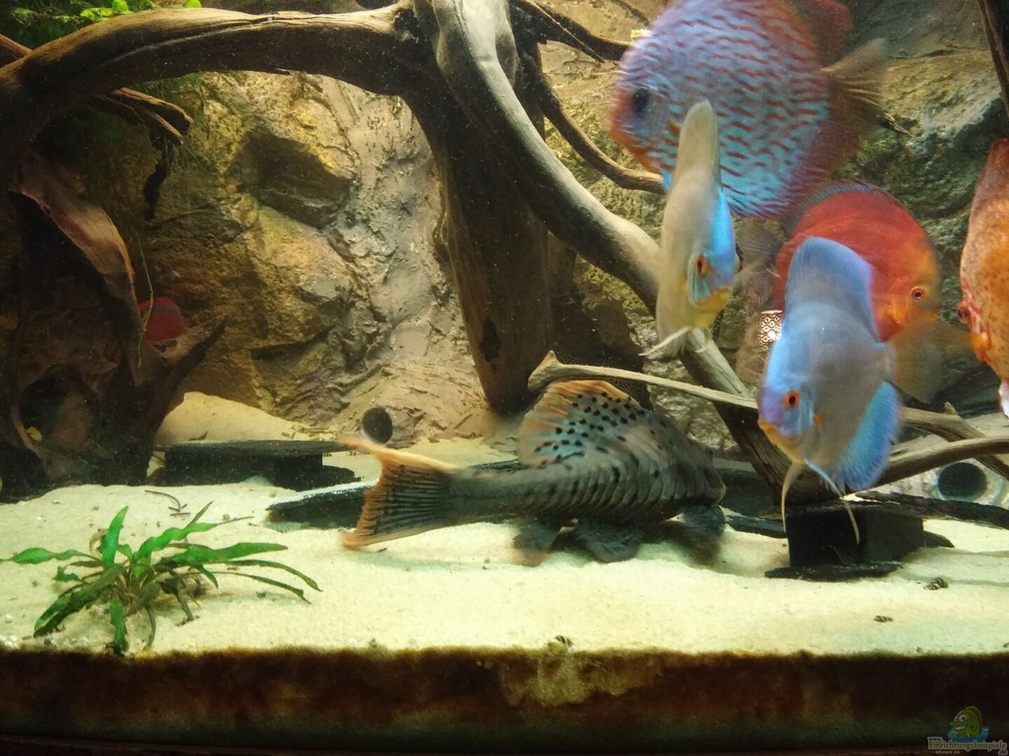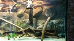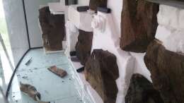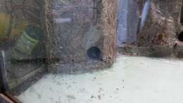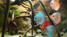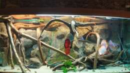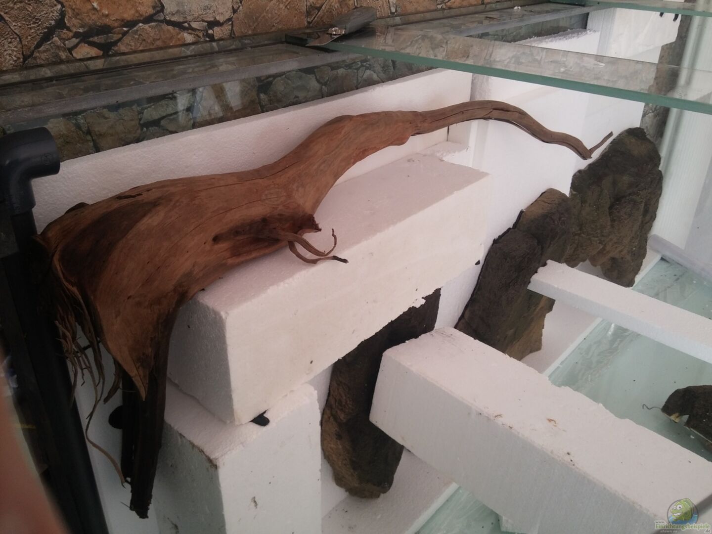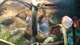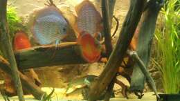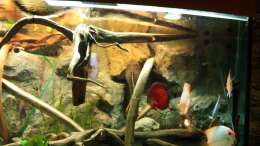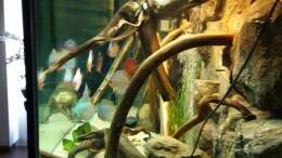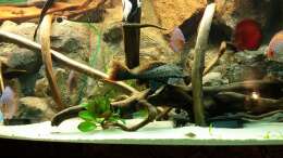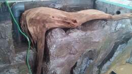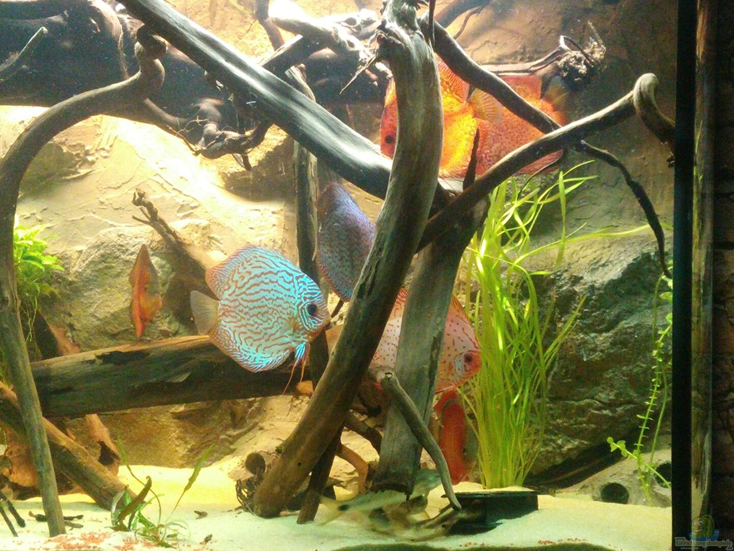 Ich hatte zunehmend Probleme mit sehr schreckhaften Diskus. Das lag offensichtlich an der Hygiene im Becken. Ich hatte durch die eingeklebte Terrasse und die beiden unterschiedlichen Bodengründe (Sand und Kies) ein paar Gammel Stellen im Becken. Ich habe mich dann dazu entschlossen, die Trennung im Bodengrund zu entfernen und den vorhandenen Kies durch Sand zu ersetzen. Damit ein besserer Schmutzabtransport gewährleistet wird habe ich noch zusätzlich die bodennahe Ansaugung vom ??berlaufschacht auf 50mm aufgebohrt. Des weiteren habe ich die Rückwand nachgearbeitet und noch 2 mal mit Epoxidharz versiegelt. Aufgrund des dünnen Sandbodens ist die Einbringung von Pflanzen auf ein Minimum zurück gegangen. Dafür ist noch weiteres Holz ins Becken gekommen. Dabei handelt es sich um einen gro??en Ast eines Wallnussbaumes.