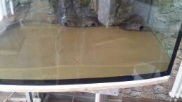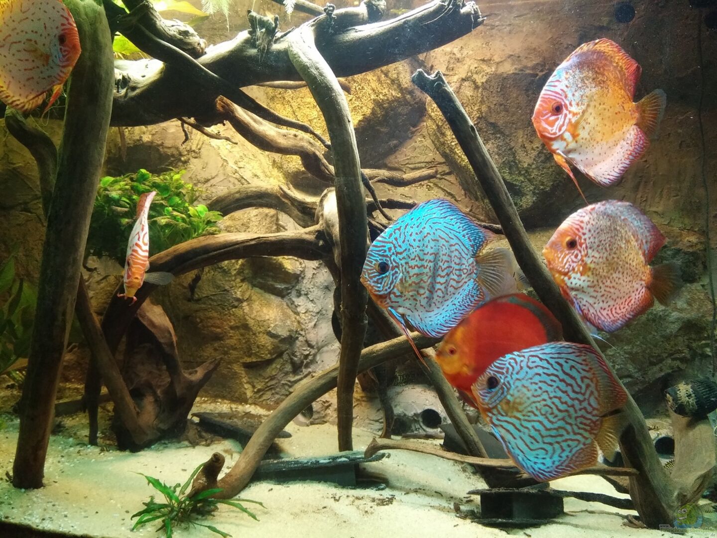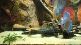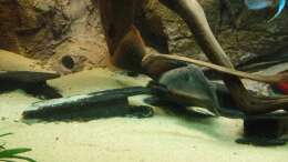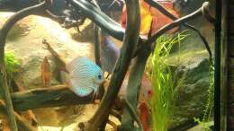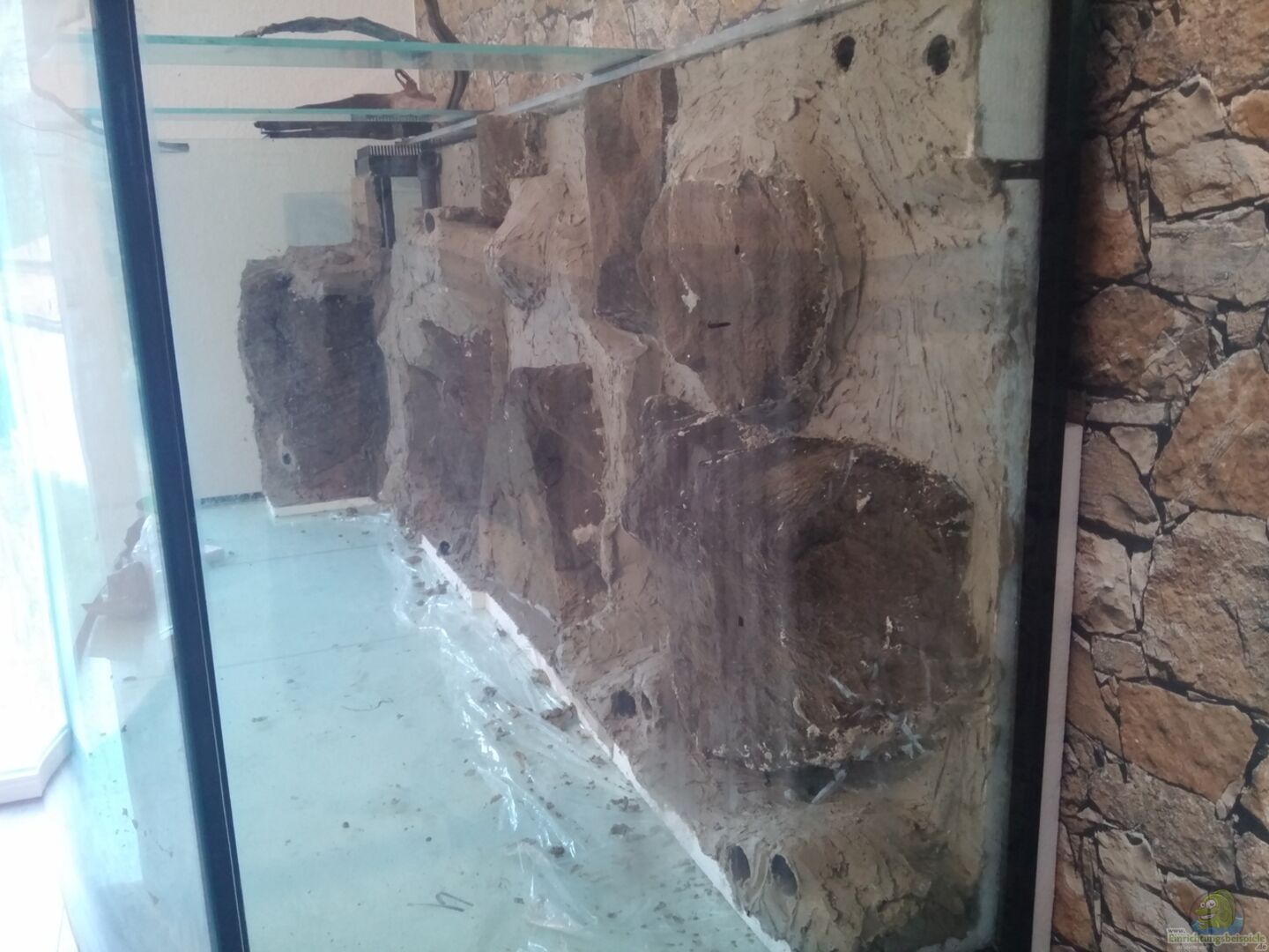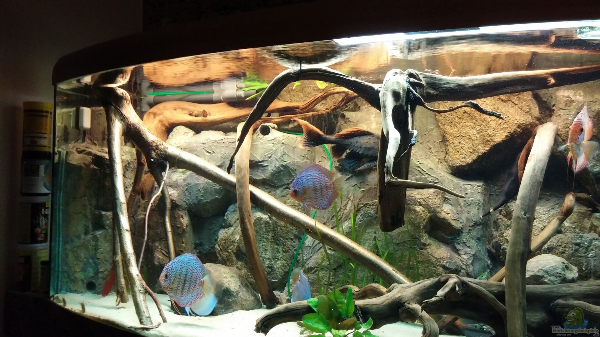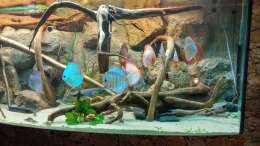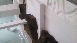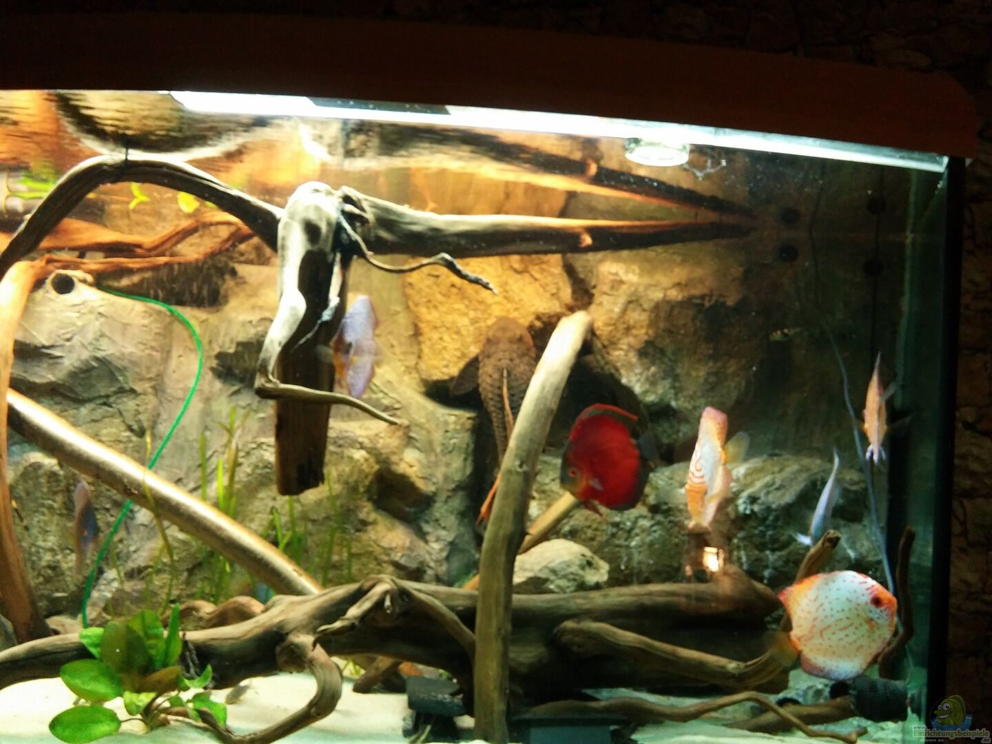 Ich hatte zunehmend Probleme mit sehr schreckhaften Diskus. Das lag offensichtlich an der Hygiene im Becken. Ich hatte durch die eingeklebte Terrasse und die beiden unterschiedlichen Bodengründe (Sand und Kies) ein paar Gammel Stellen im Becken. Ich habe mich dann dazu entschlossen, die Trennung im Bodengrund zu entfernen und den vorhandenen Kies durch Sand zu ersetzen. Damit ein besserer Schmutzabtransport gewährleistet wird habe ich noch zusätzlich die bodennahe Ansaugung vom ??berlaufschacht auf 50mm aufgebohrt. Des weiteren habe ich die Rückwand nachgearbeitet und noch 2 mal mit Epoxidharz versiegelt. Aufgrund des dünnen Sandbodens ist die Einbringung von Pflanzen auf ein Minimum zurück gegangen. Dafür ist noch weiteres Holz ins Becken gekommen. Dabei handelt es sich um einen gro??en Ast eines Wallnussbaumes.