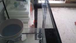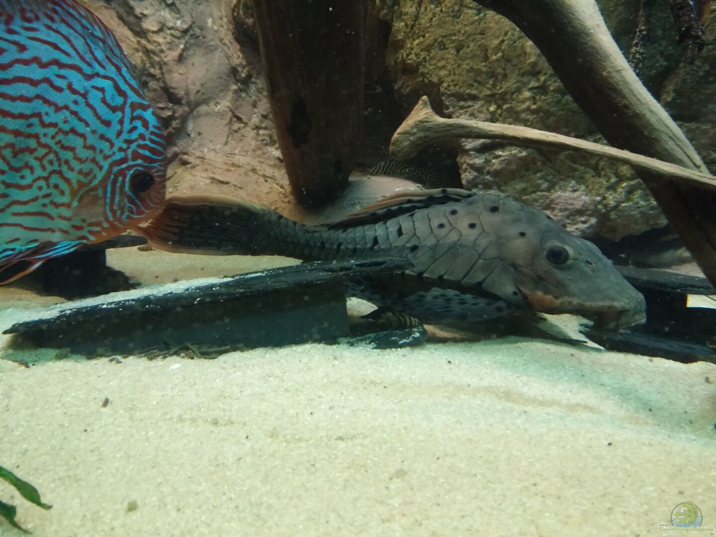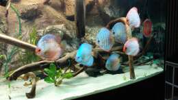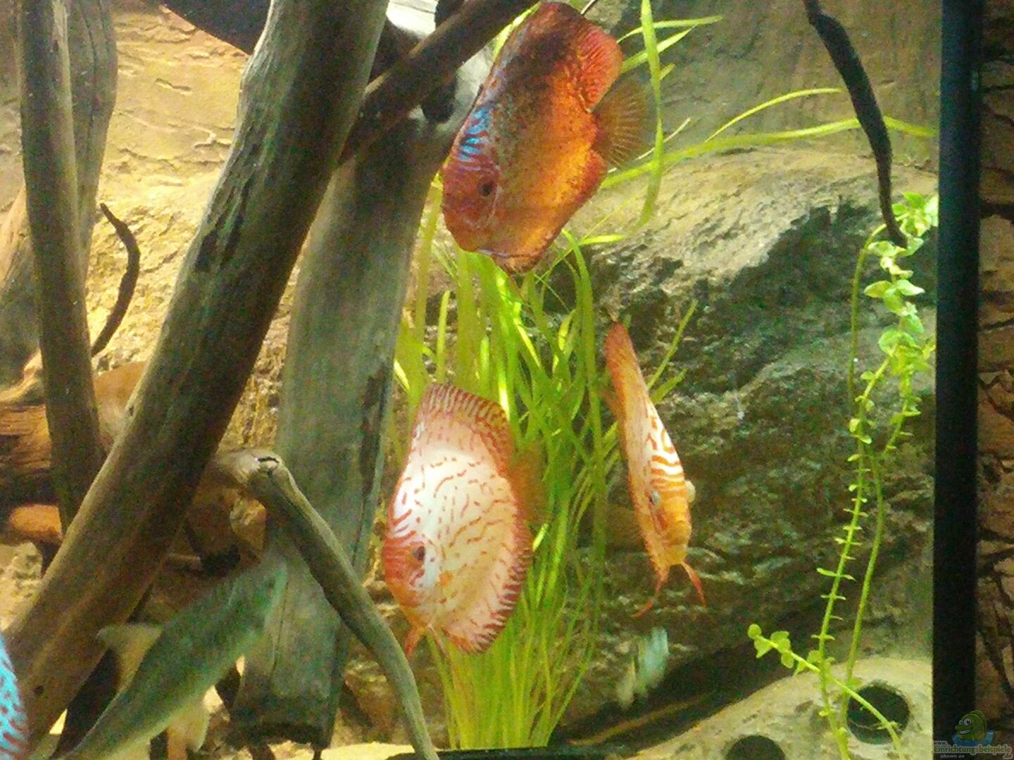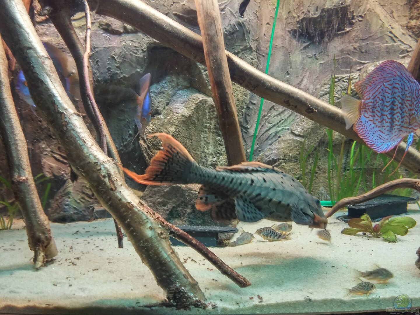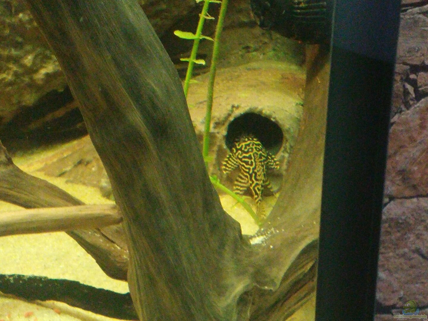 Ich hatte zunehmend Probleme mit sehr schreckhaften Diskus. Das lag offensichtlich an der Hygiene im Becken. Ich hatte durch die eingeklebte Terrasse und die beiden unterschiedlichen Bodengründe (Sand und Kies) ein paar Gammel Stellen im Becken. Ich habe mich dann dazu entschlossen, die Trennung im Bodengrund zu entfernen und den vorhandenen Kies durch Sand zu ersetzen. Damit ein besserer Schmutzabtransport gewährleistet wird habe ich noch zusätzlich die bodennahe Ansaugung vom ??berlaufschacht auf 50mm aufgebohrt. Des weiteren habe ich die Rückwand nachgearbeitet und noch 2 mal mit Epoxidharz versiegelt. Aufgrund des dünnen Sandbodens ist die Einbringung von Pflanzen auf ein Minimum zurück gegangen. Dafür ist noch weiteres Holz ins Becken gekommen. Dabei handelt es sich um einen gro??en Ast eines Wallnussbaumes.