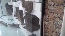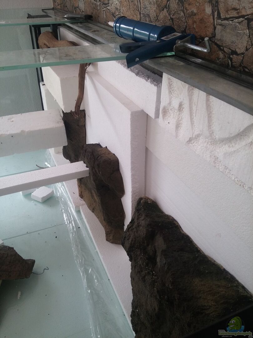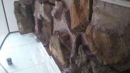 Selbst gebaute Rückwand auf Basis von 7 Back to Nature Rock Modulen, die auf Styropor geklebt sind und mit Fliesenkleber verspachtelt wurden. Nach einer farblichen Anpassung habe ich die Rückwand mit Epoxidharz versiegelt.