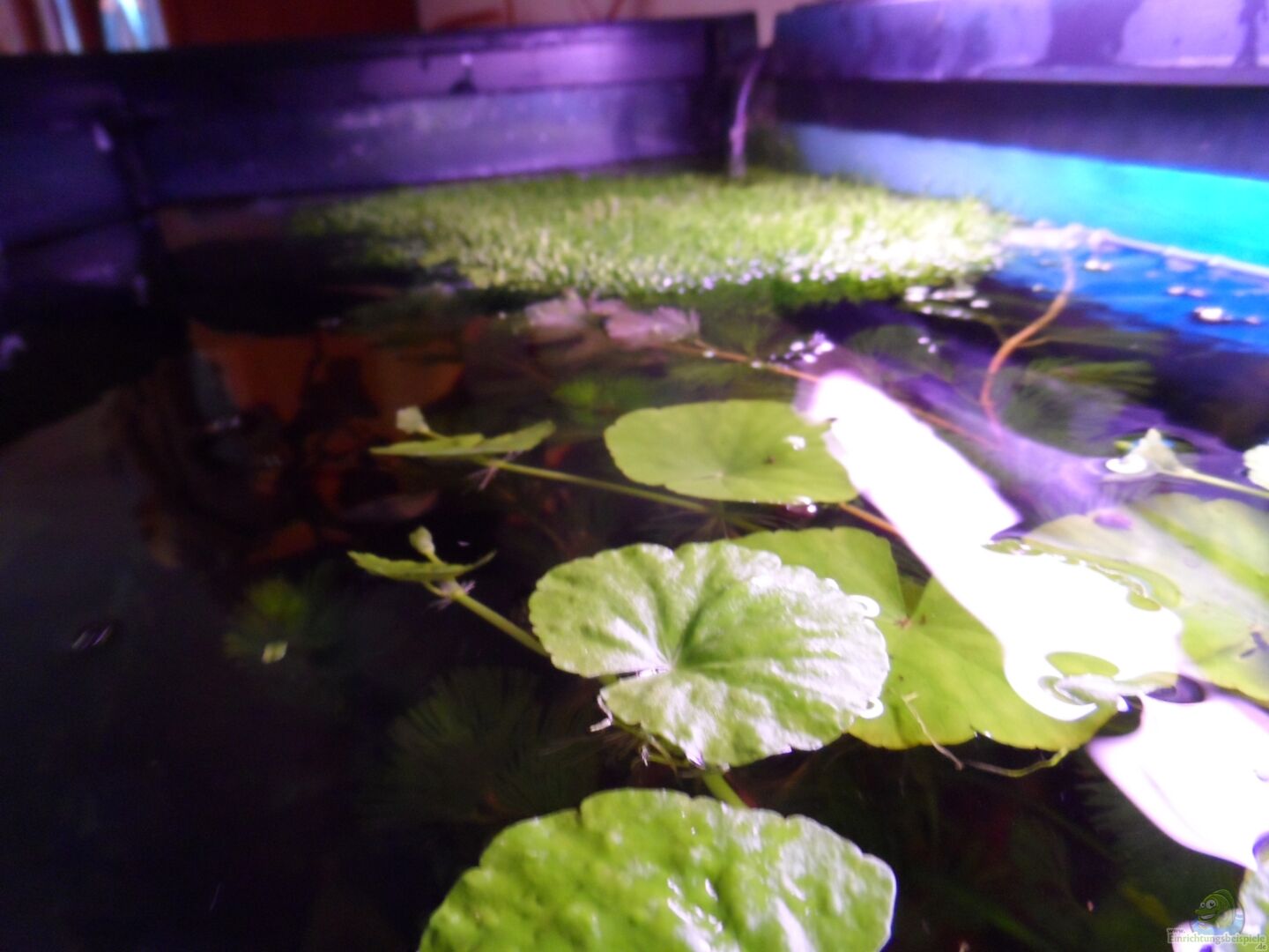 -roten Tigerlotus und Cabomba croliniana als Schwimmpflanzen fungieren der kleinblättrige Wassernabel und Teichlebermoos