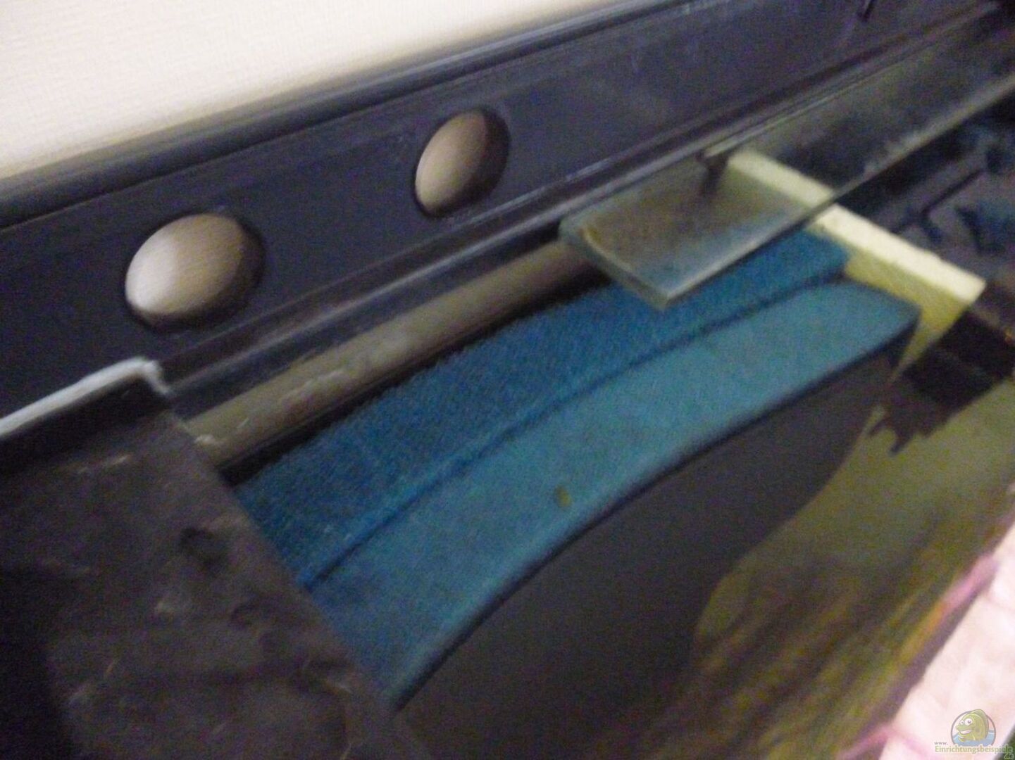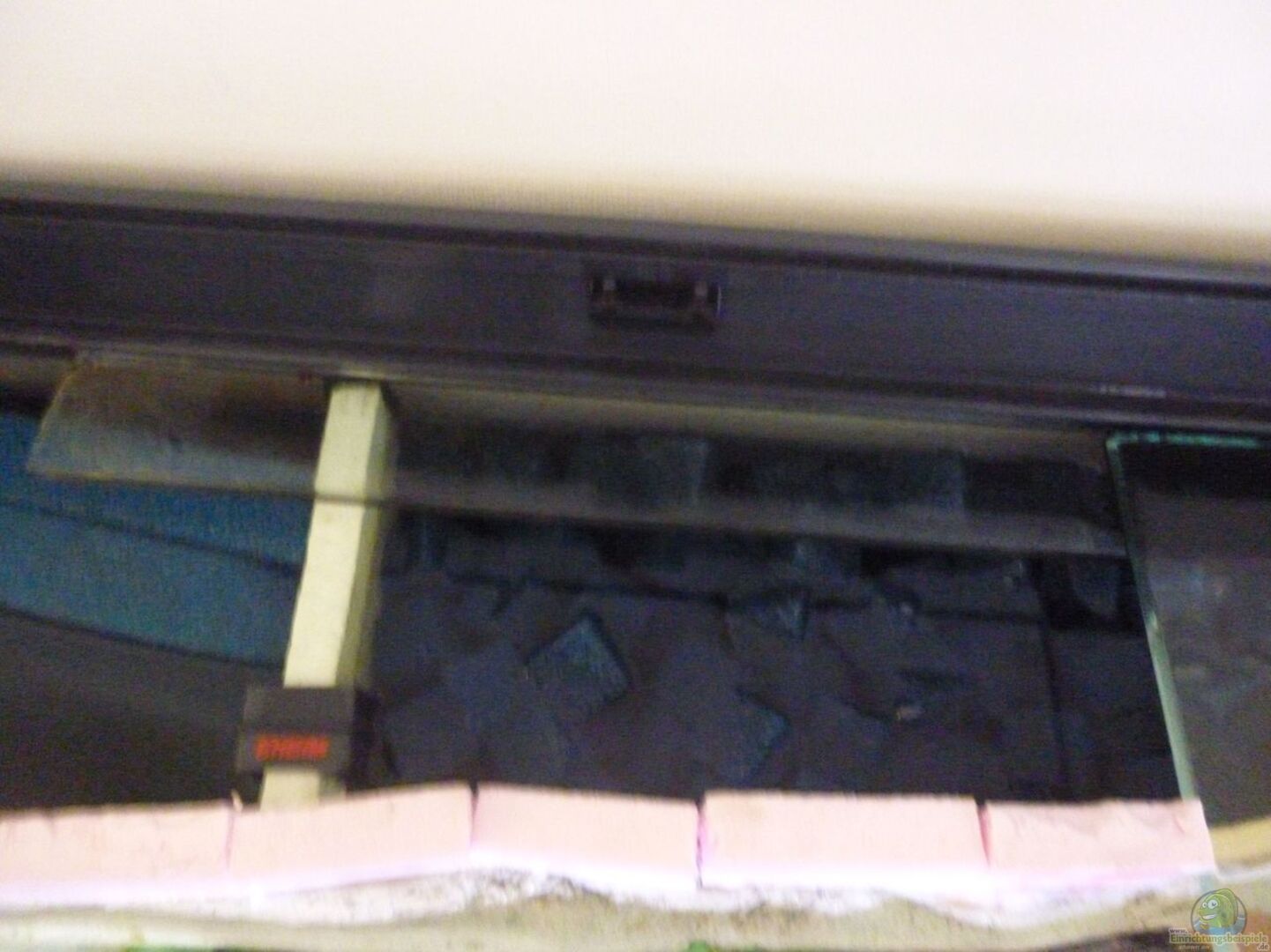 Filterung erfolgt über den Rückwandfilter. Die Rückwind ist mit 2 Wänden in 3 Kammern geteilt. Die erste Kammer ist auf der linken Seite und dient als Vorfilter. Hinter den zwei Einläufen sind parallel zur Front/Rückscheibe 2 Filtermatten gesteckt. Das Wasser durchströmt beide Matten und kommt dann durch drei Löcher in der Trennwand in die gro??e mittlere Biokammer. Hierdrin sind ca 75L Filterwürfel. Die Biokammer wird zusätzlich mit 2 Eheim Luftpumpen belüftet. Dana geht es weiter in die dritte Kammer. Hierdrin befinden sich CO2, Heizung und die 2 JBL u800 (je 7Watt und 900l/Std.). Von hier wird das Wasser wieder durch die Rückwand auf die andere Seite gepumpt. So komme ich auf ca. 1800 l/Std.