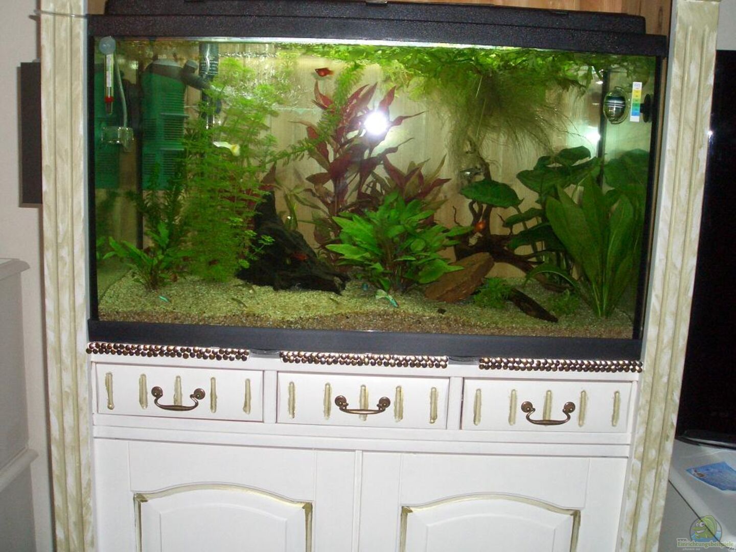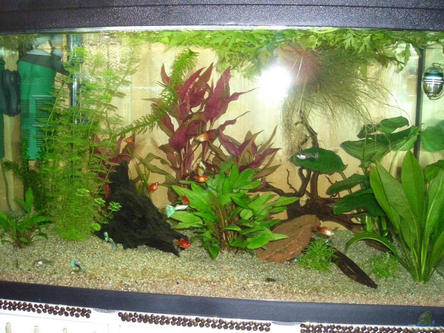 Wir haben zu früh besetzt. Auf einmal Horrorwerte bezgl. Nitrit. Habe es dann mit Wasserwechsel und ProClean in den Griff bekommen. Wir haben sogar eine kleine Anzahl von Guppy- und Platybabies in der Schwimmpflanze entdecken können.