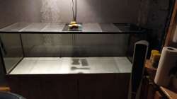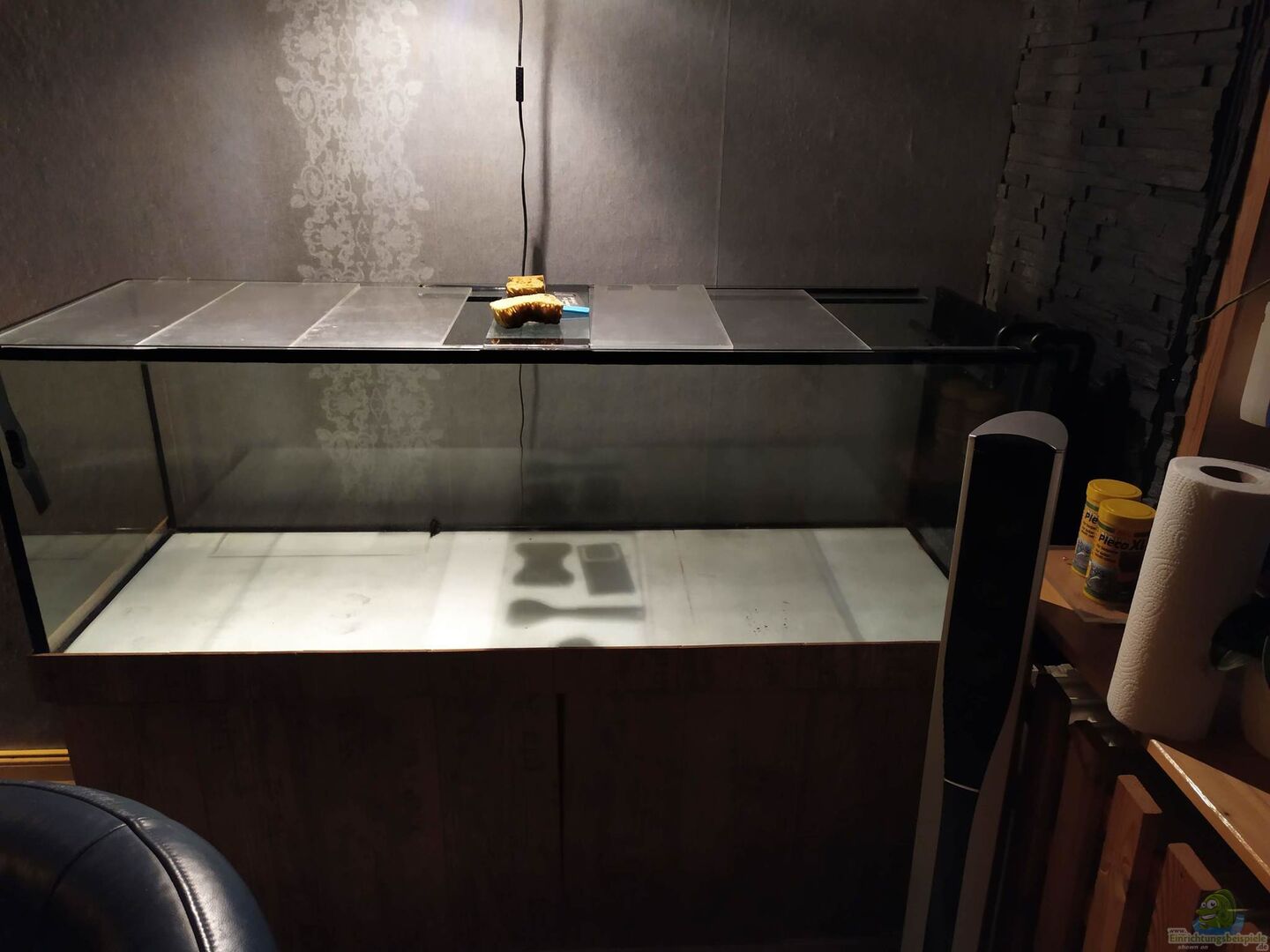 - eine schwarze Holzplatte (Möbelrückwand) in Kunststoffschienen aussen am Aquarium als Rückwand, da ich mir erst nicht sicher war, ob Farbe und welche oder evtl. doch eine Fotofolie. Eine Strukturrückwand hatte ich vorher im Malawi Becken und wollte ich in diesem nicht einbauen um mehr Weite zu haben.