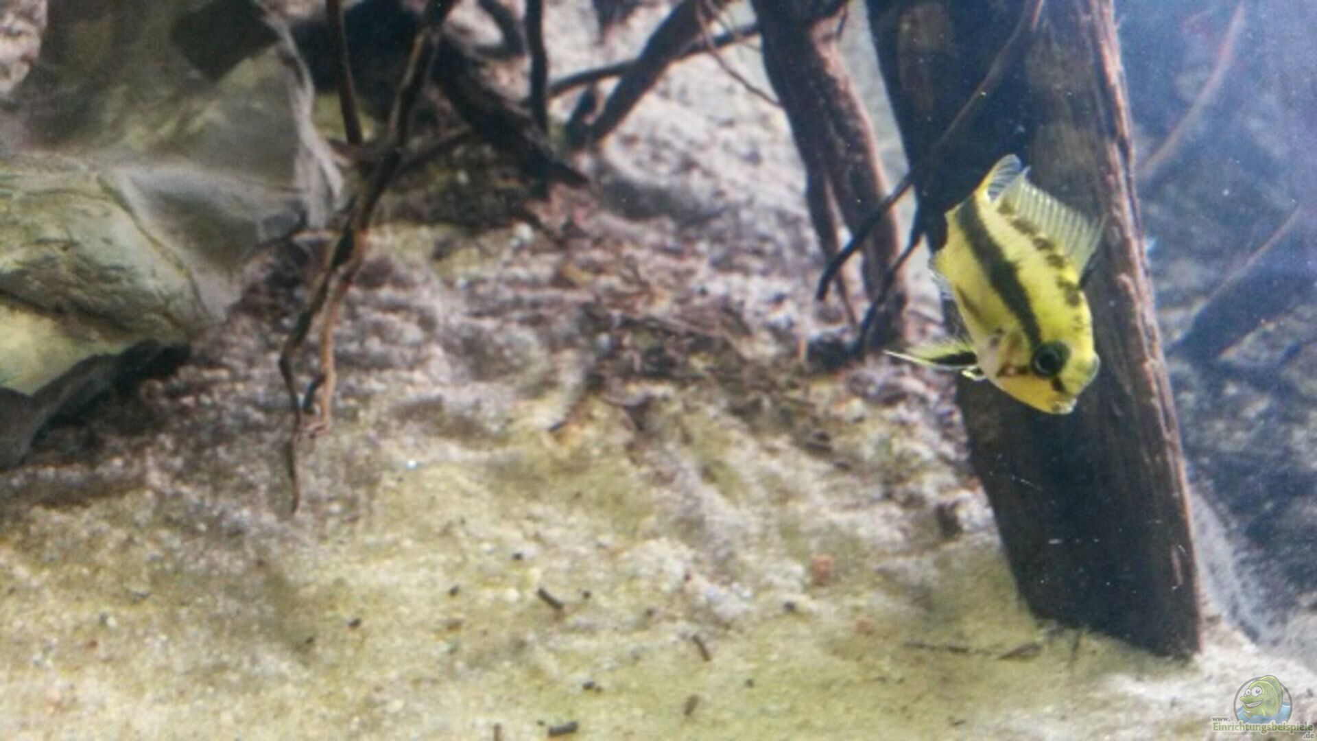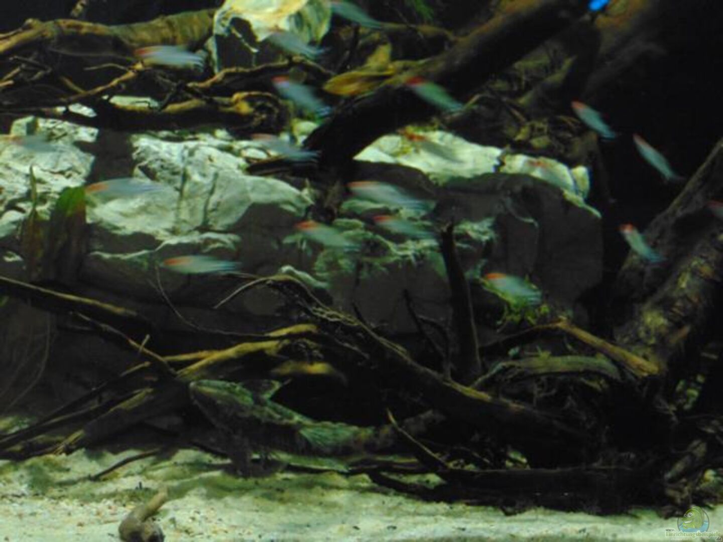 Es sind 20 Hemigrammus bleheri eingezogen. Toll zu beobachten, wie sie im Schwarm ihre Runden durchs Becken ziehen. Die Mikrogeophagus altispinosus haben die Totholzzone angenommen, vom Unterholz aus erkunden sie das Becken. Bei Unruhe ziehen sie sich wieder in die Totholzzone zurück.