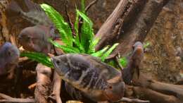 Da es sich hierbei ja meist um Aufwuchspflanzen handelt, konnten Diese direkt in die Steine und auf die Wurzeln gesetzt werden, was bei teils grabenden Barschen und Welsen sehr von Vorteil ist. Die alten Vallisneria gigantea und ein Teil des Schwimmpflanzenteppichs wurden beibehalten, aber stark ausgedünnt. Der Schwimmpflanzenteppich besteht zur Zeit nur noch aus dem südamerikanischen Froschbiss und ein "paar" Wasserlinsen. Die Wasserhayzinthen werden von Zeit zu Zeit, mehr oder weniger als zusätzliches Futter eingebracht:
