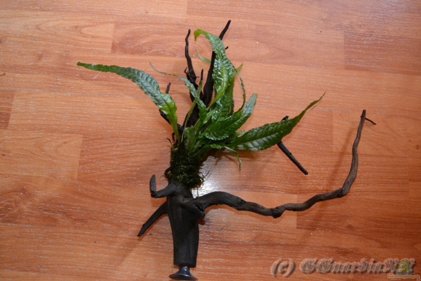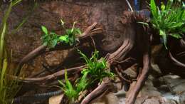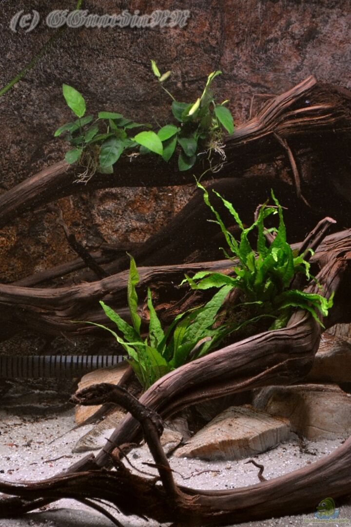 Auf Grund der grossen und sehr "ruppigen" Fische, wurden am 21.10.2011 die Echinodorus-Arten erstmal komplett herausgenommen und gegen Javafarn und Anubia barteri var. nana ausgetauscht. Zusätzlich sind noch 2 Thail. Wasserlilienim Pflanzstein dazugekommen. Es wurde jetzt praktisch "barschfest" bepflanzt.