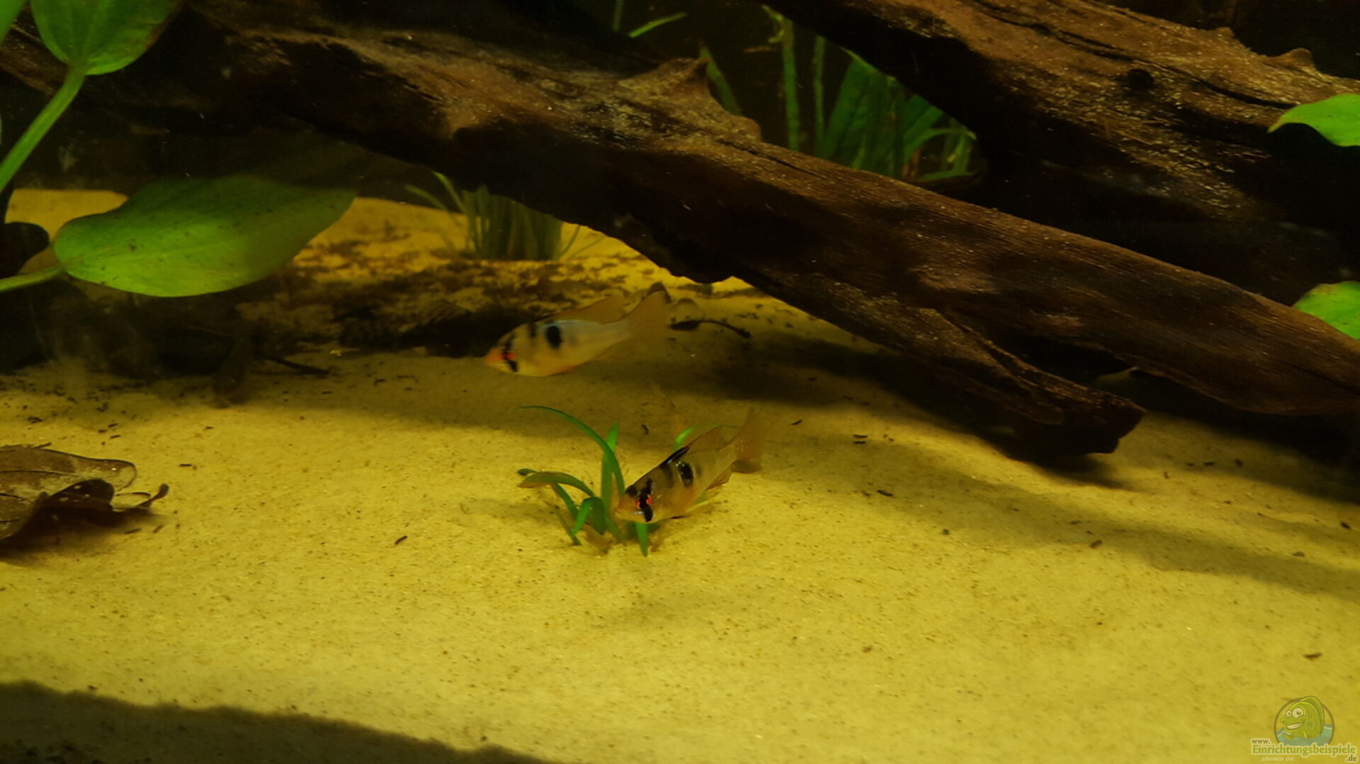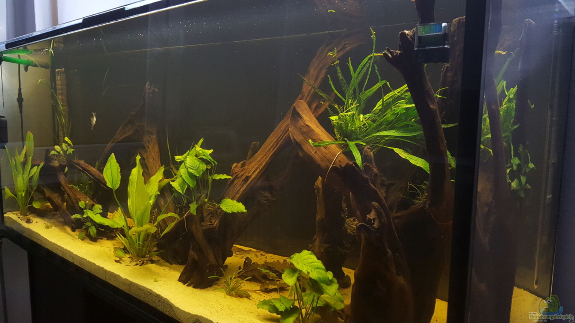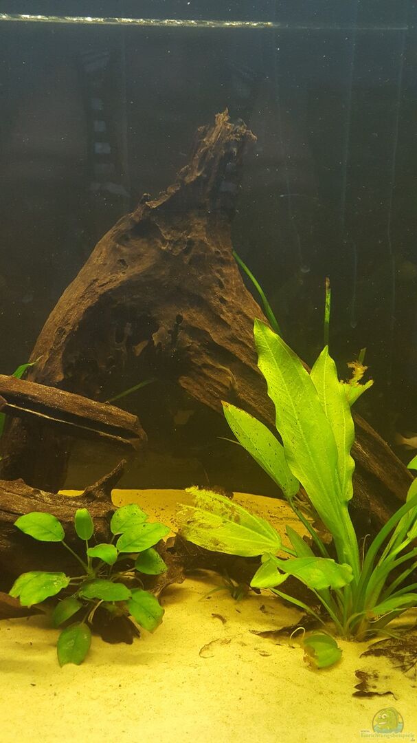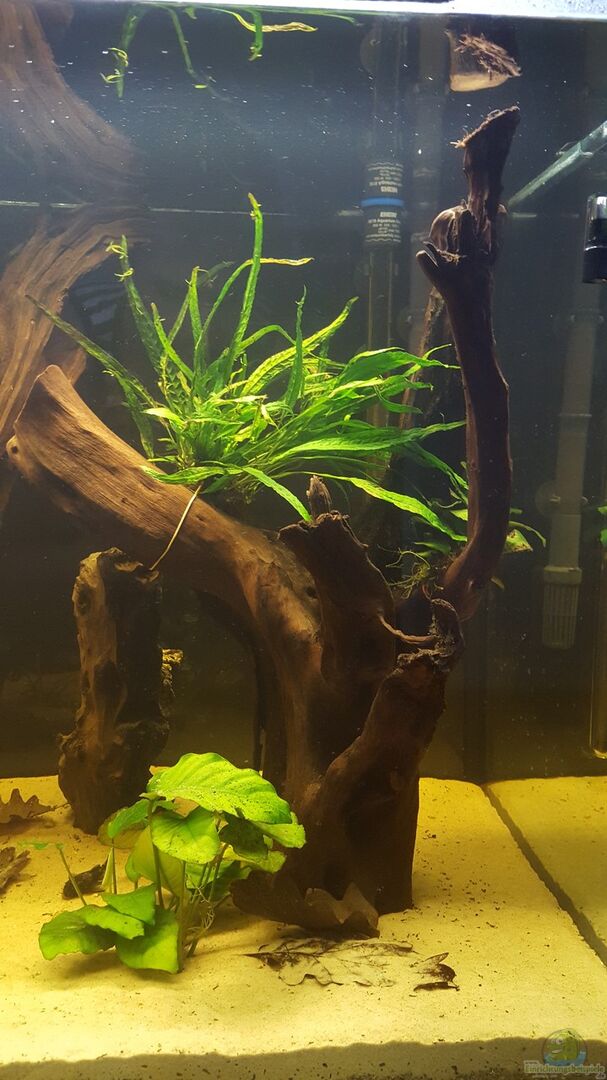 Die linke Wurzel wurde mit Silikon und einer Korkplatte an der linken Glaswand befestigt, sodass sie ins Aquarium hineinragt und einen gro??en Unterstand mit einer Höhe von 5 cm bietet. Da die gro??e rechte Wurzel noch schwimmt ist diese ebenfalls mit dem gleichen Prinzip am Boden befestigt.