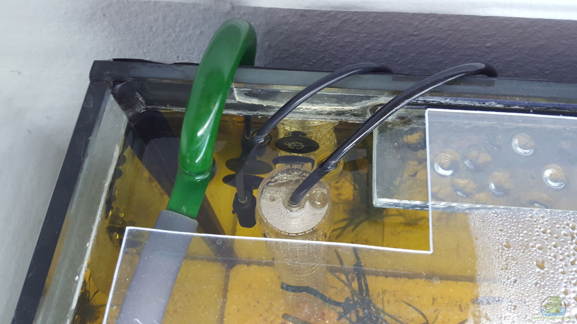 Die Abdeckung des Beckens habe ich abgenommen. Stattdessen befinden sich jetzt zwei Platten aus Polystyrol (lebensmittelecht) auf dem Becken mit einer Dicke von 0, 6 cm. Diese zwei Platten sind so zurecht geschnitten, dass sämtliche Technik ins Aquarium einlaufen kann. Zudem wurde ein Rechteck als "Futterloch" eingeschnitten. Gefüttert wird jedoch aus 3 verschiedenen Stellen.