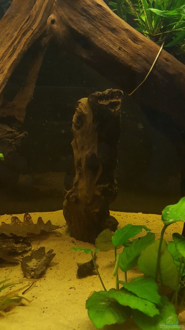 Au??erdem befindet sich im Aquarium Eichenlaub. Zum einen aus Dekorationsgründen, zum anderen aber auch dazu, um die Karbonathärte zu senken. Durch die Eichenlaubblätter erhält das Aquariumwasser eine "bernsteinfarbene" Färbung.