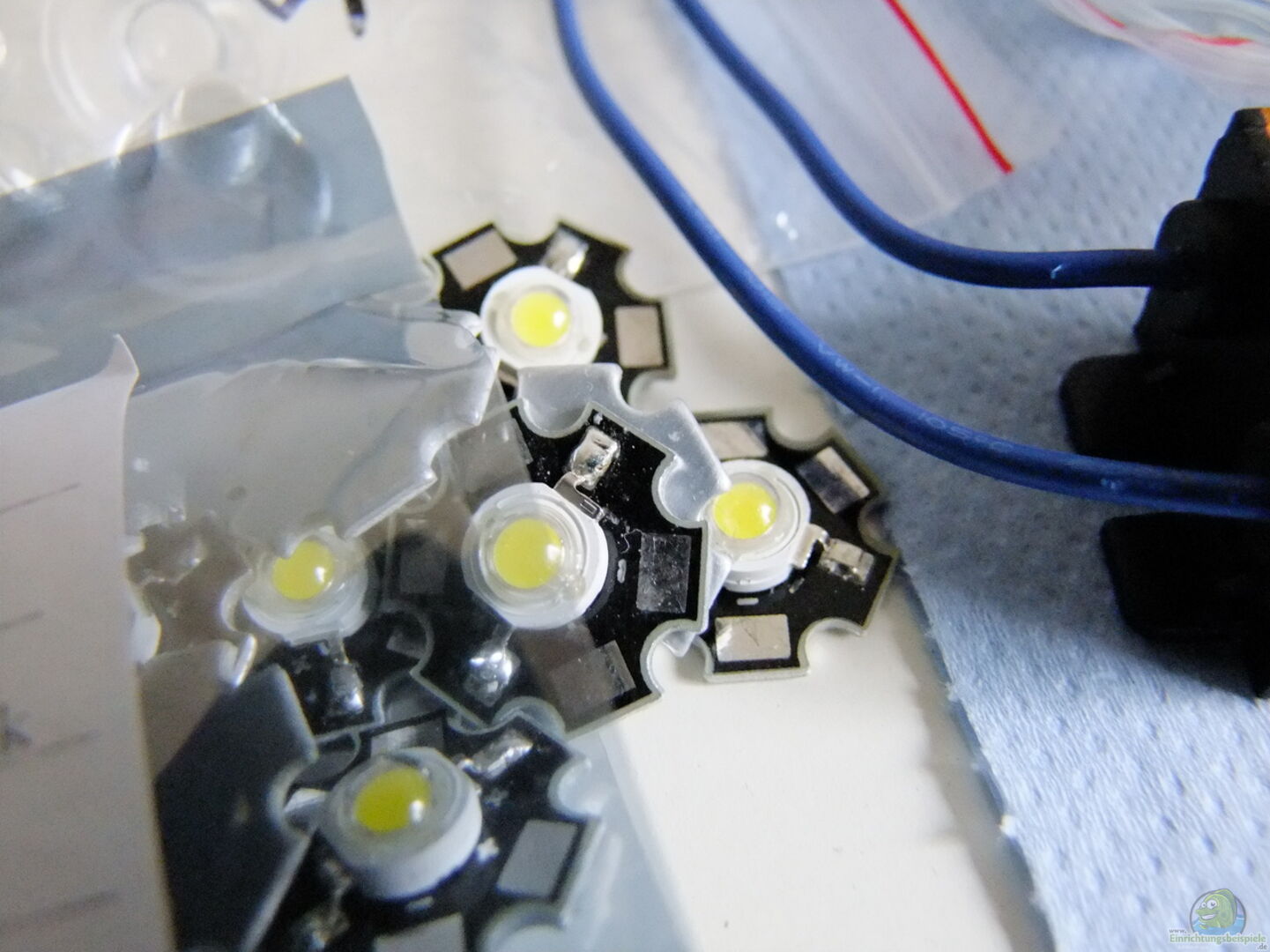 Diese besteht aus 24x 1Watt SATIS LEDs auf die ich Linsen mit verschiedenen Streuungen gesetzt habe. Dazu noch einen 0, 5 Meter RGB-LED Streifen für die Lichtfarbe. Die habe ich dann auf ein Vierkant Alu Rohr geklebt das zur Wasserkühlung dient. Das ganze habe ich dann noch mit einer Hartschaumplatte verkleidet und dann alles in Epoxidharz eingegossen um es Wasserfest zu machen.