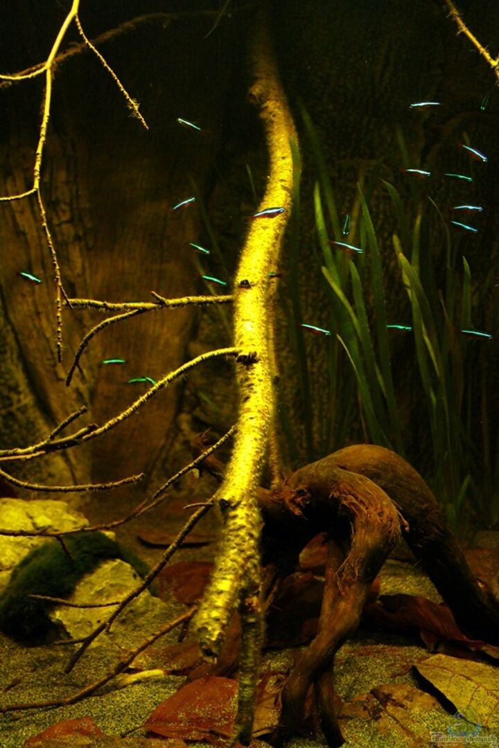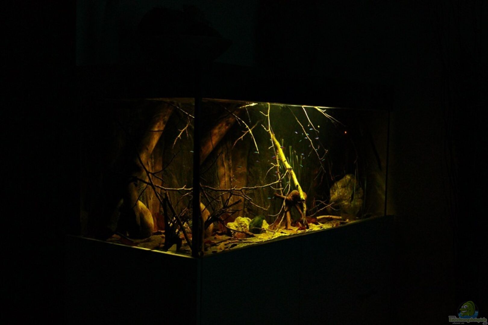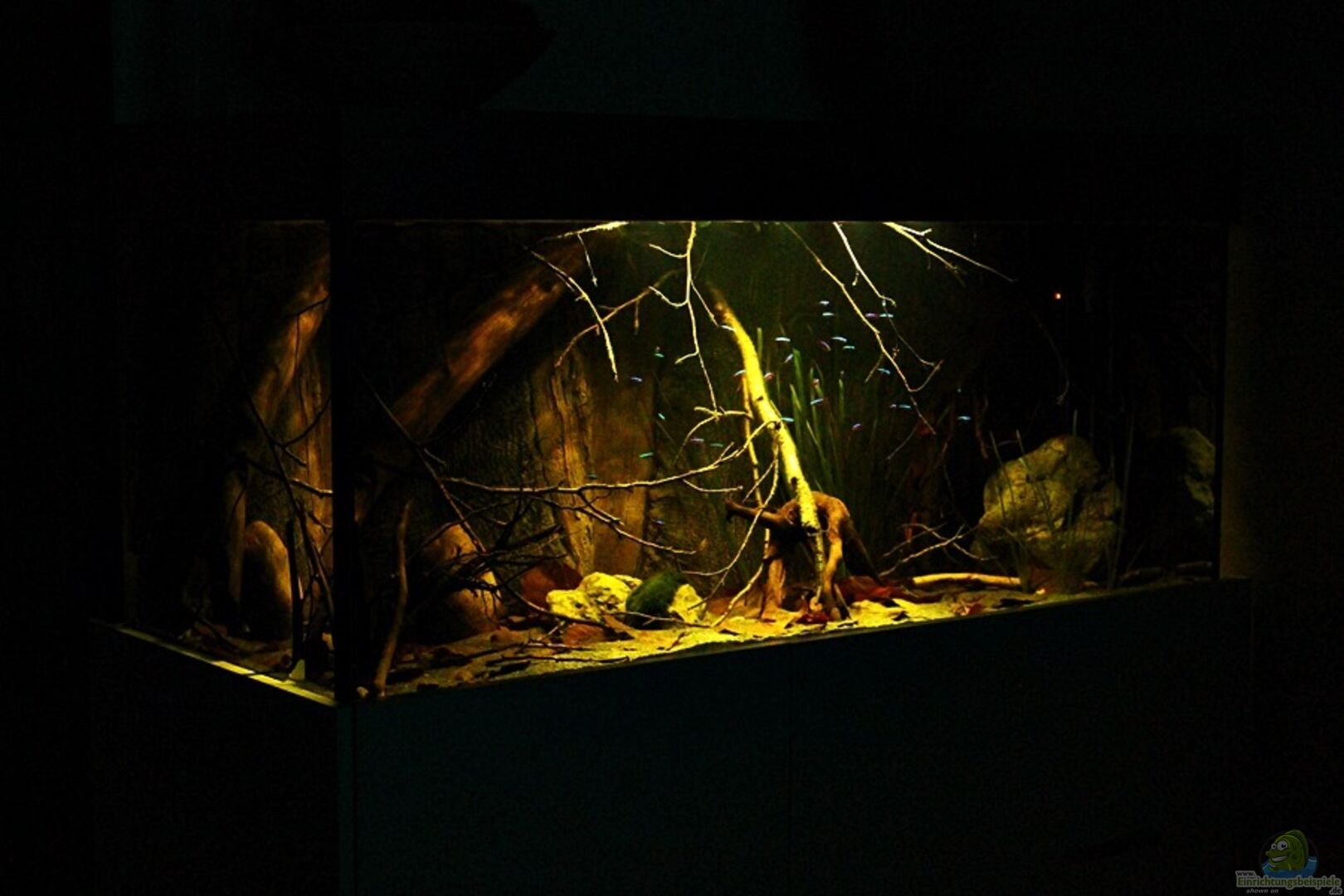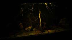 Gruppenfisch. Dunkel gehaltene Becken mit einigen ??sten und Pflanzen.