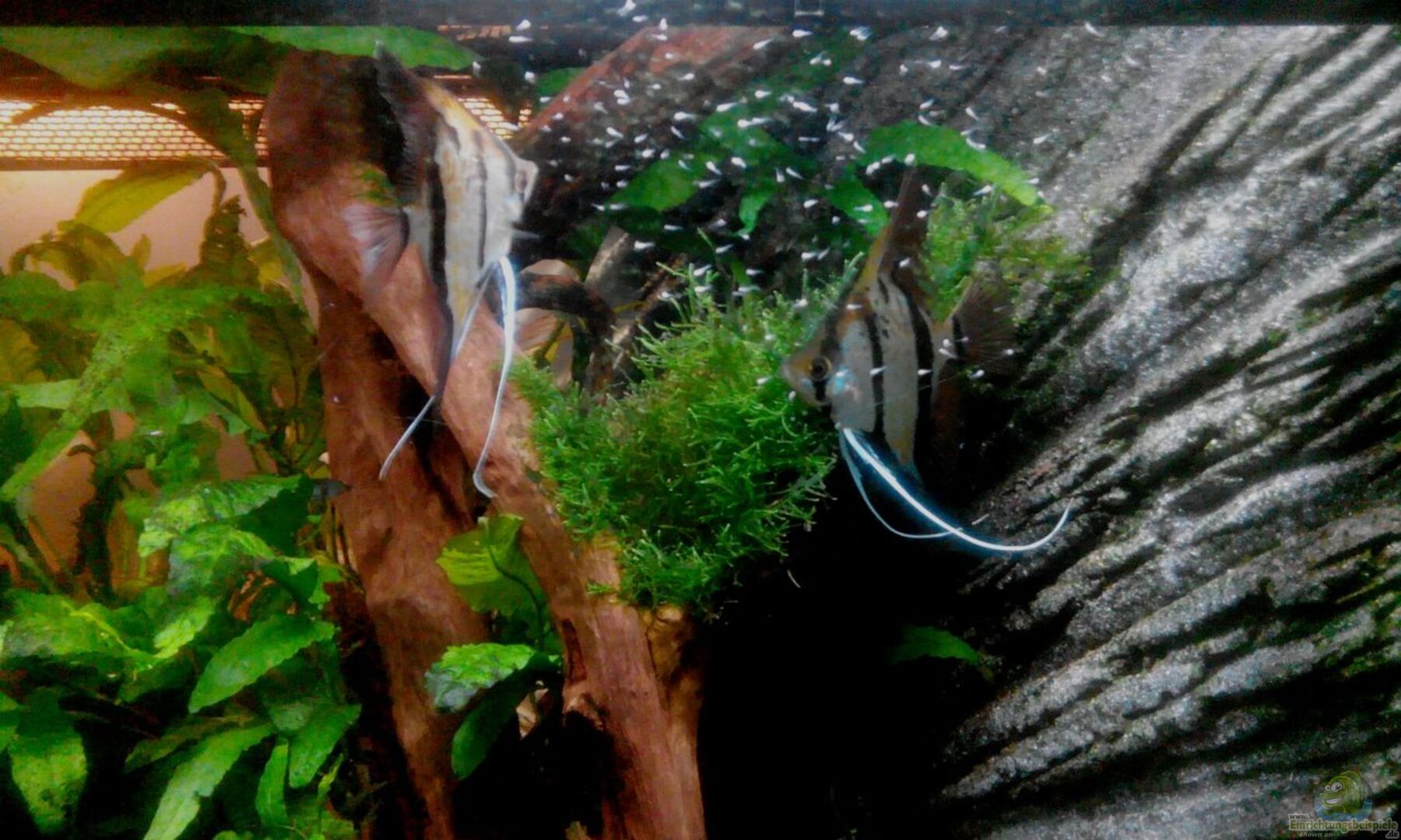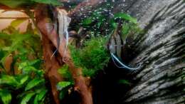 Hunderte kleine Mini-Skalare schwimmen in einer Ecke des Aquariums herum und werden von den Eltern gut bewacht. Andere Fische trauen sich nicht mal mehr in die Nähe. Die kleinen Ausrei??er werden immer wieder eingefangen und gegen die Felswand gespuckt. Toll dabei zuzusehen!
