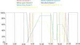 Diese Leuchten sind, immer eine vorne und eine hinten zusammen, getrennt über GHL LED Contol 4 V2 angesteuert. Sie starten zeitversetzt von links nach rechts um je 20min am Morgen und gehen ebenso abends wieder aus. Au??erdem soll bei ihnen die Wolkensimulation eingeschaltet sein, ebenfalls von links nach rechts (Passatwinde!)