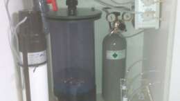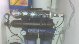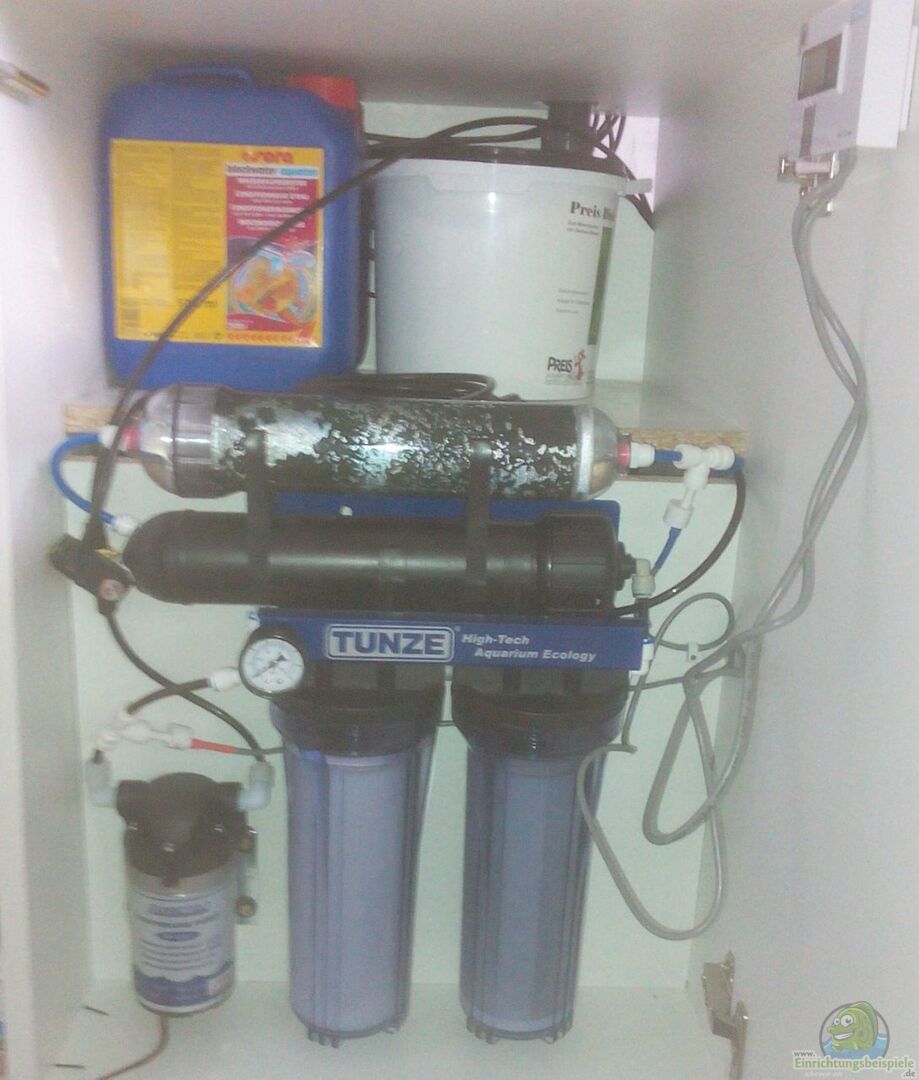 Für den automatischen Wasserwechsel gibt es eine Regensimulation. Im Unterschrank ist hinter der RO-Anlage ein Dennerle Nanocube 60 als Regenwassertank eingebaut. Dieser wird von der Osmoseanlage gefüllt, bis ein Niveausensor bei vollem Tank anspricht.