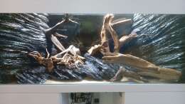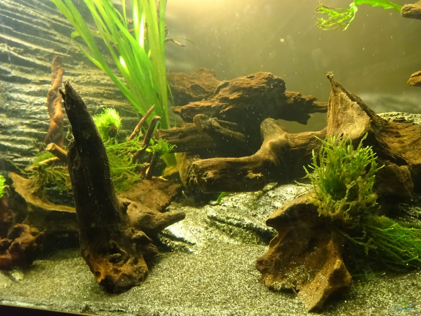 Eine Mischung aus JBL Sansibar dark, feinem schwarzen Kies und Quarzsand ist im vorderen Teil des Beckens von ca. 2cm bis 4cm ansteigend verteilt. Dahinter beginnen die "Felsen"