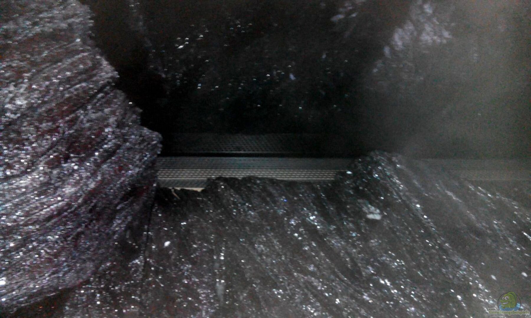 In jeder Ecke hinter den "Felsen" ist ein Mattenfilter mit je einer Tunze 5005. Der rechte saugt das Wasser am Boden entlang der Rückwand über einen Gitterkanal (PVC- Trauflüftungsgitter aus dem Dachdecker-Bedarf) an und lässt es entlang der Frontscheibe an der Wasseroberfläche über ein Rohr mit vielen kleinen Bohrungen wieder raus. Links ist auf die gleiche Weise die Ansaugung hinten oben und der Auslass vorne unten. Die beiden Pumpen sollen gegenläufig in Wellen mal stärker, mal schwächer laufen, um die Strömung etwas chaotisch zu gestalten. Davon erhoffe ich ich mir einerseits einen Trainingseffekt für die Fische und andererseits eine gute Durchmischung des Wassers.