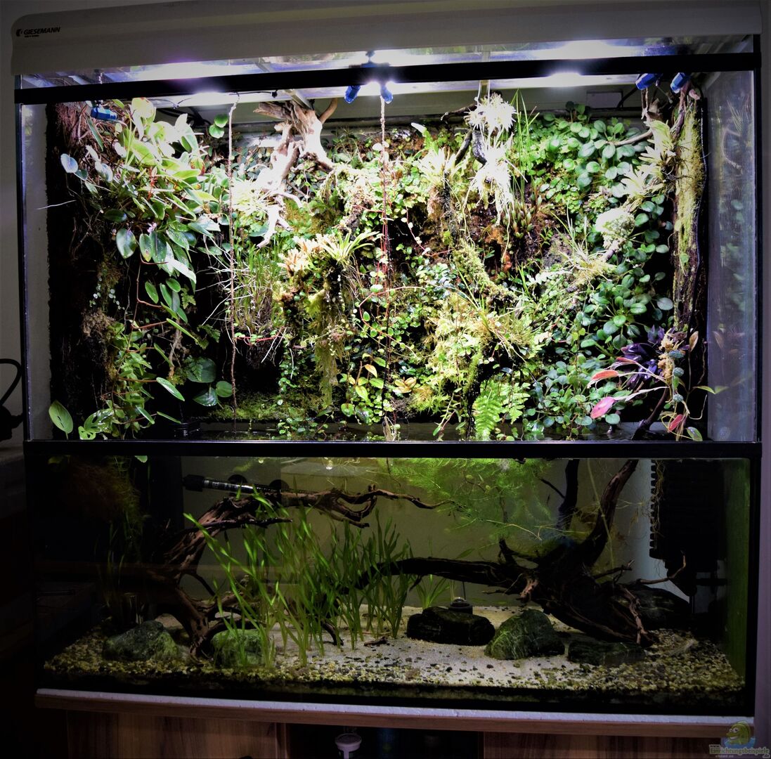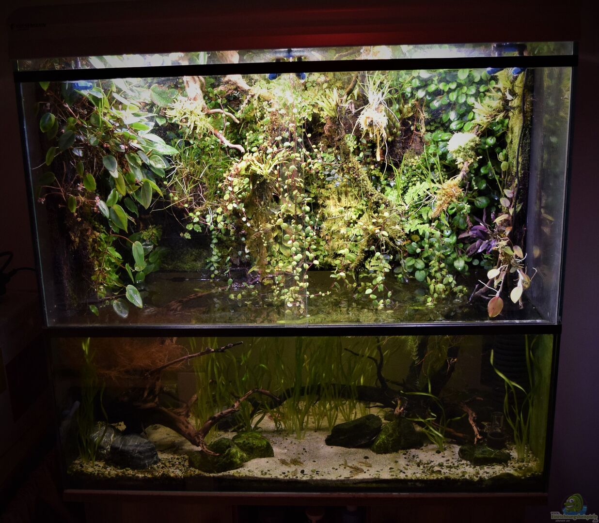 Sonderanfertigung von Aquarien und Terrarienbau Jebramek in Nürnberg. Der Wasserstand beträgt 35 cm. Ein mit Kabelbindern zusammen gebundenes Aluminium-Gestell befindet sich in der Abdeckung und fungiert als Decke, um darin Wurzeln anzubinden, die ebenso mit Kabelbindern zusammengehalten werden. Weiterhin hängen von der Decke künstlich erstellte Lianen. Sie wurden aus Paketschnur, Aquariensilion und einer Mischung aus gehäckselten Xaxim- und Weisstorf-Resten erstellt. Um das Ganze noch natürlicher erscheinen zu lassen wurden Pflanzen wie z.B. Peperomia und diverse Orchideen-Arten mit etwas chilenischem Sphagnum-Moos daran aufgebunden. Der Wasserinhalt des unteren Wasserteils beträgt ca. 175 Liter (100x50x35). Die Rückwand des unteren Teils ist schwarz gestrichen. Somit sind der Filter und Heizstab kaum zu entdecken. Man muss schon genau hinsehen.