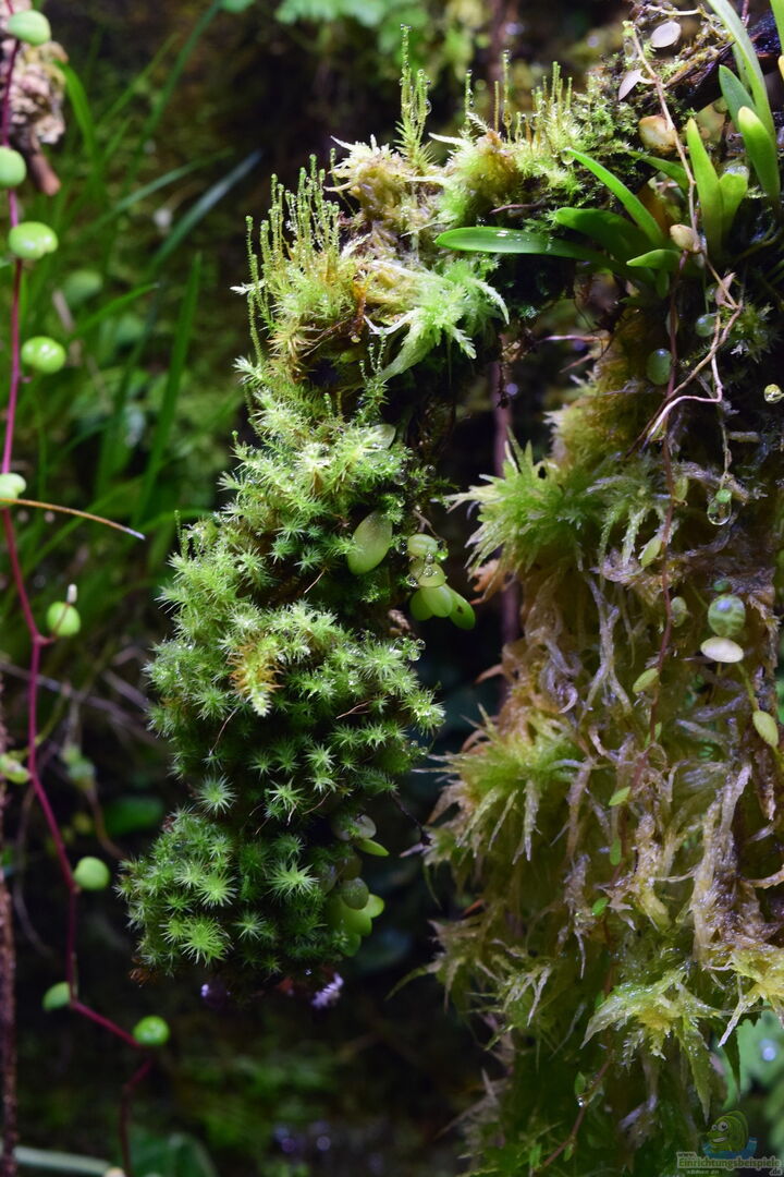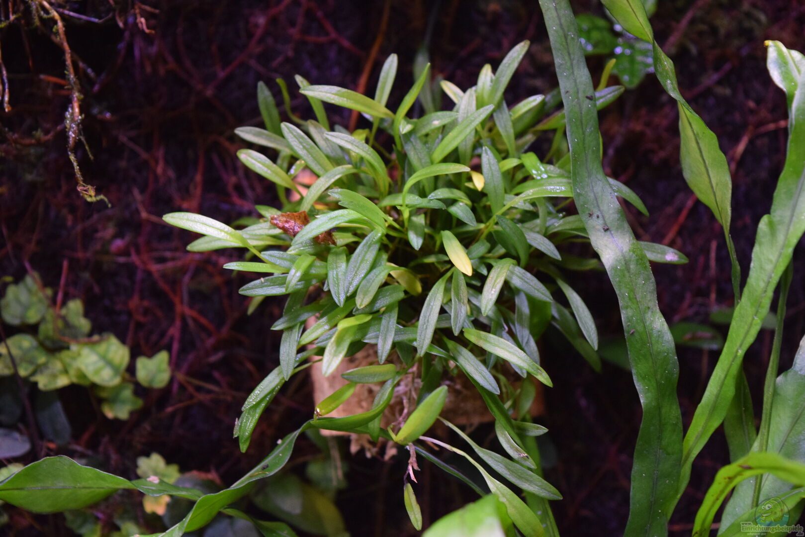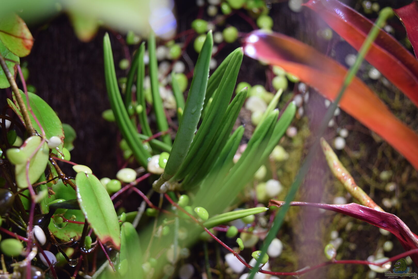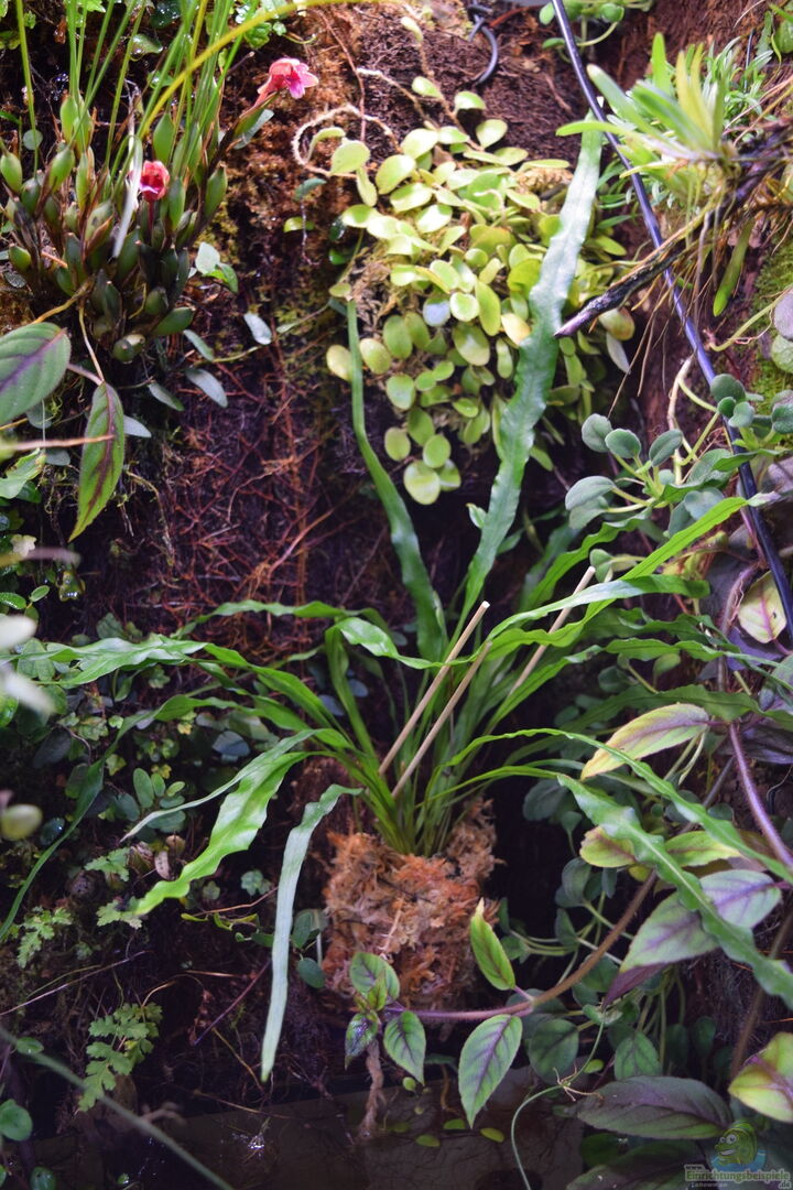 Neoregelia green pointet, Neoregelia schultesiana purple red, Epidendrum Porpax, Dischidia hirsuta, Microgramma reptans, Peperomia rostrata, Epidendrum cochleatum, , Gomesa radicans, Dendrobium wassellii, Barbosella cogniauxiana, Sphagnum-Moos, Ficus quercifolia, Restrepia trichoglossa, Stelis sp., Peperomia hoffmanii, Pyrosia nummularifolia, Campyloneurum angustifolium, Pyrrosia lanceolata