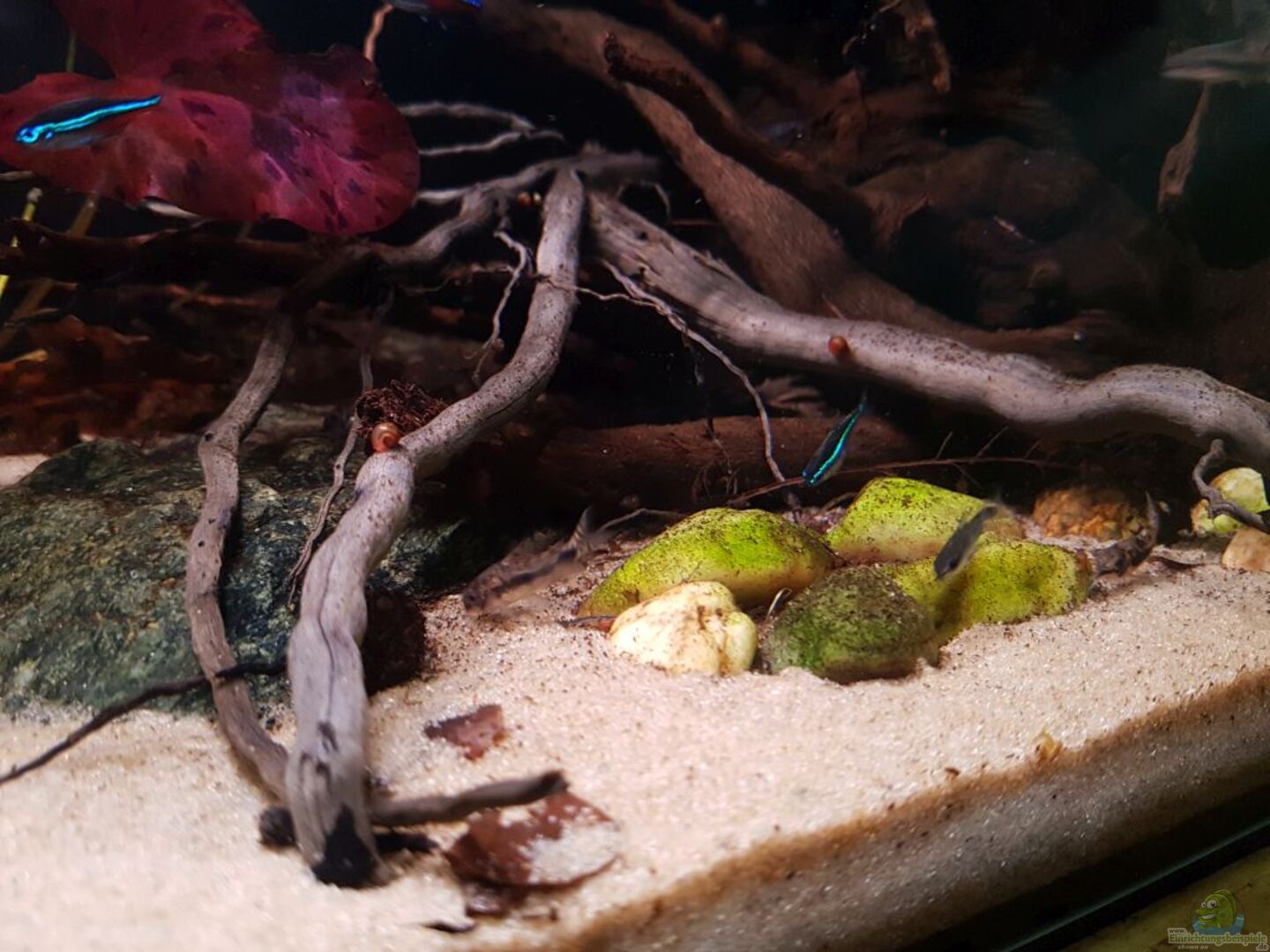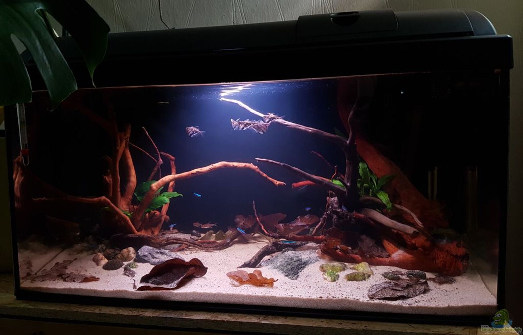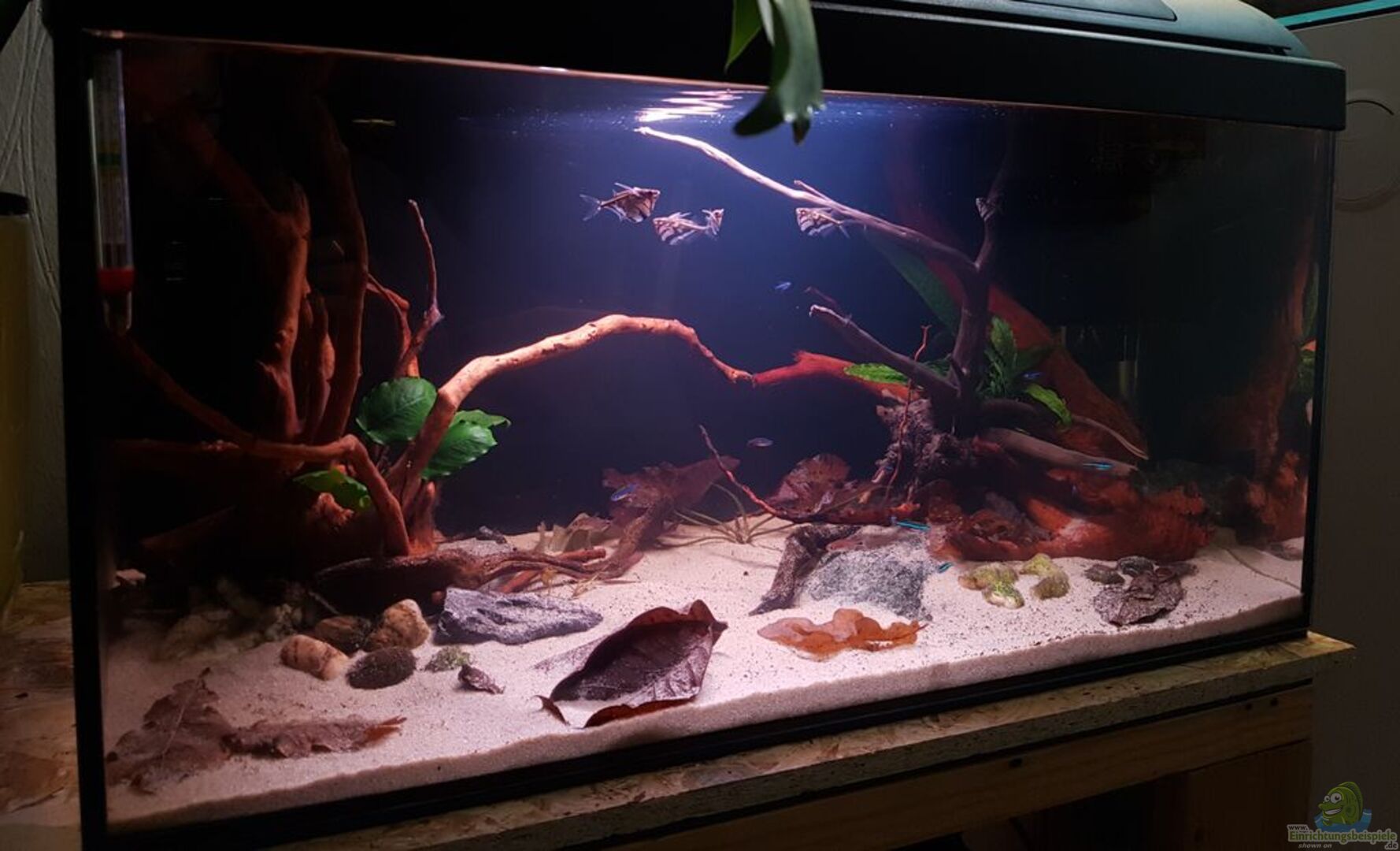 Das erste Aquariun welches ich einmal komplett ohne Pflanzen betreiben wollte. Hat nicht ganz geklappt ;o) Drei kleine Pflänzchen haben es doch ins Aquarium geschafft. Kann aber sein, dass ich die Grünpflanzen doch noch einmal herausnehme. Mal schauen was mir letztendlich besser gefällt.