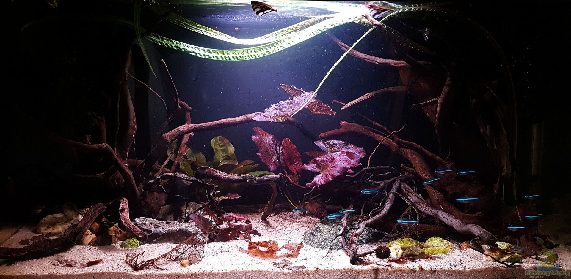 Au??erdem haben mir schon immer Amazonas- bzw. Südamerika Biotop Aquarien gefallen. Jetzt wollte ich es auch einmal umsetzen. Wenn auch nur in einer ganz kleinen Variante. Ich finde den Kontrast des "schummrigen Ambientes" mit den blauen Neons einfach wunderbar !!! :o)