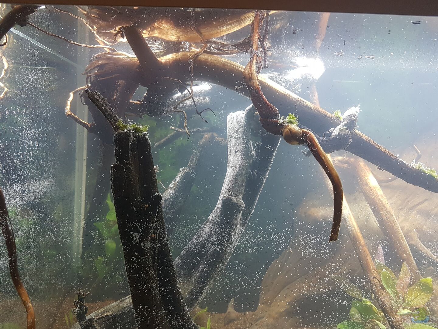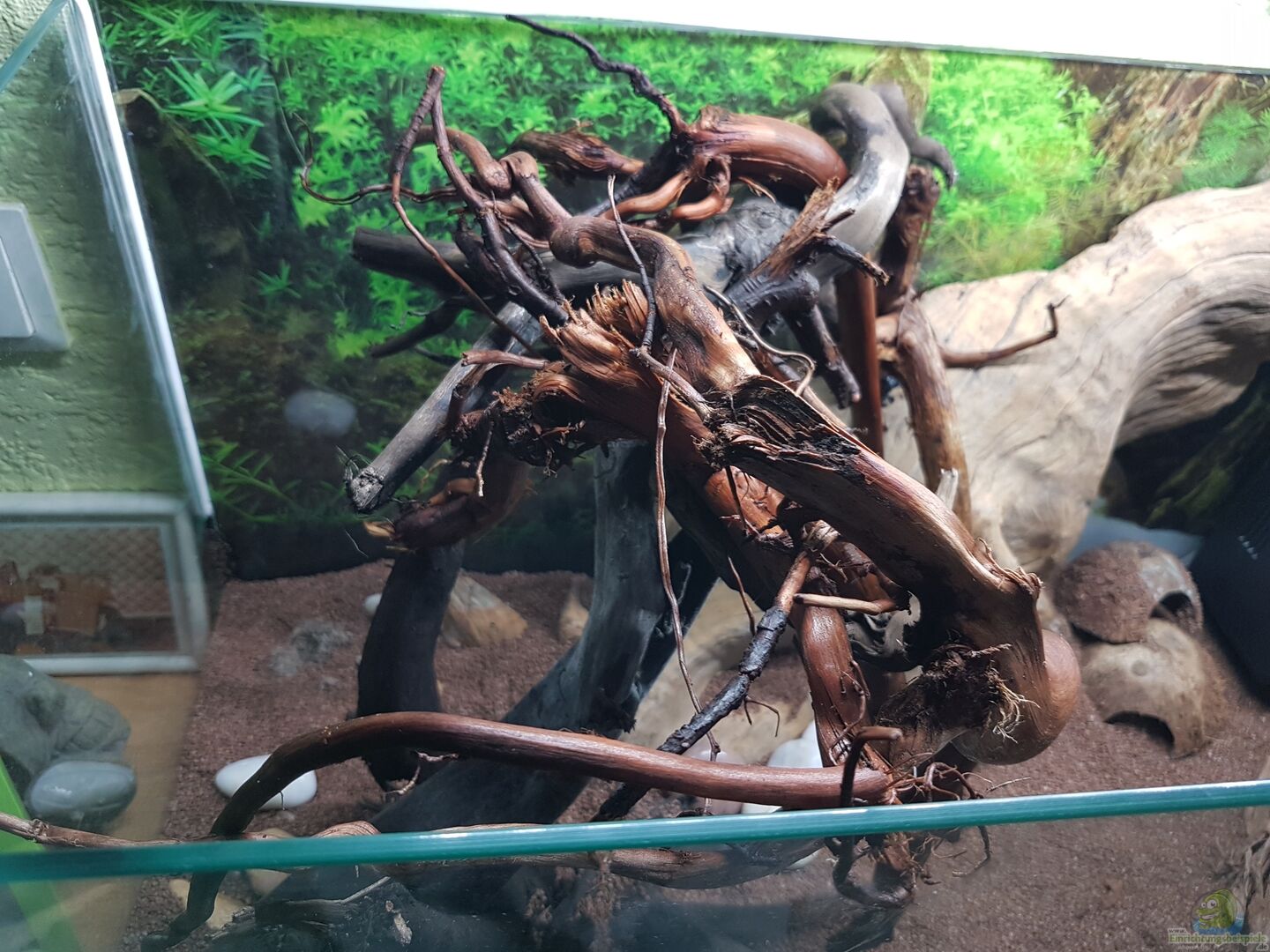 Eine Dicke Wurzel an der Rückwand hingestellt so das sie vom Boden bis zur Wasseroberfläche reicht. Es ist eine Mangrovenwurzel und die haben wir über A....n bezogen und wahren sehr überrascht von der Schönheit dieser Wurzel.