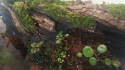 Moos vom Balkon und aus dem Garten. Im ??bergangsbereich zur Wasserfläche Sphagnum Moos und Javamoos. Darin wachsen einige Pflanzen aus meinem Wabikusa. Somit haben diese schon die Umstellung auf einen emersen Wuchs bewältigt.