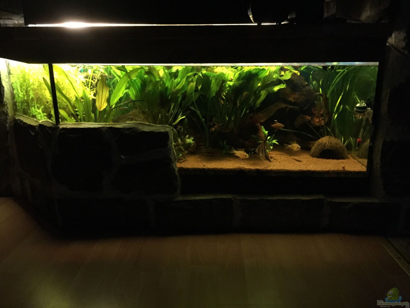 Dieses Aquarium hat mein Vater 1998 selbst gebaut und deshalb hat es auch solch komische Ma??e. Eine weitere Besonderheit ist die schräge Aquarium Scheibe an der linken Seite. Und dann ist diesen Becken noch zum Teil mit Stein verkleidet dieses Verkeildung diente zur verdeckend der Glasstützen für eine Steinplatte auf der sich früher Schildkröten ausruhen konnten. Bis 2010 diente es als Schildkröten Aquarium. Das erklärt auch diese komische Höhe des Aquriums. Und das letzte besondere Merkmal ist das dieses Aquarium nur 10cm über den Boden steht.