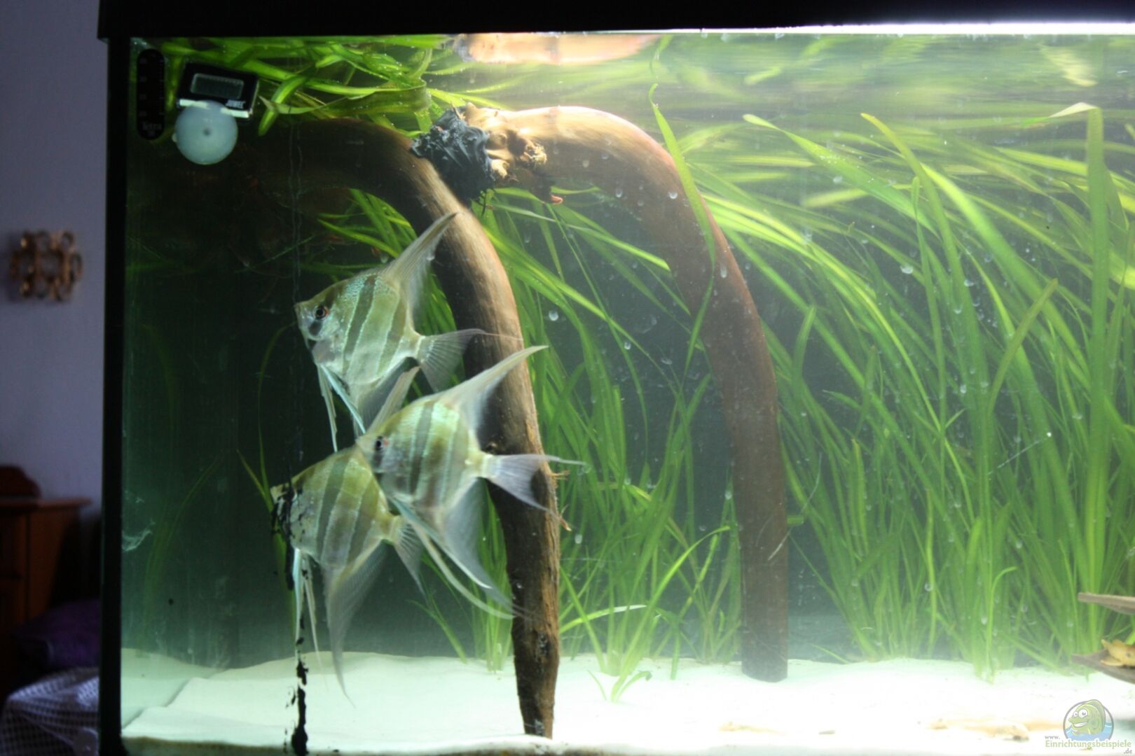 wie mein werter Kollege Alex schon geschrieben hat ist die Wurzel für deine Altums absolut nix, da können sie sich nicht unterstellen und mal zurückziehen, zur Not könntest Du ja eine verzweigtere Wurzel von oben ins Becken einhängen, das spart Dir etwas Platz. Dein Becken wirkt sehr hell, zu hell, zum 1. durch den weissen/hellen Bodengrund und dann noch die weisse Wand mit den sichtbaren Steckdosen im Hintergrund, gönne deinem AQ doch wenigstens eine schwarze, oder dunkelblaue Hintergrundsfolie als Kontrast, dann wirken die Tiere auch viel besser. Deine Vallisneria americana sind ja eher eine Art mit kurzen Blättern, da hätte ich die V. gigantea genommen, die nimmt dir nachher noch etwas von deinem vielen Licht durch Ihre langen, an der Oberfläche flutenden Blätter, ok du müsstest dann öfters mal ausdünnen ;-)) .