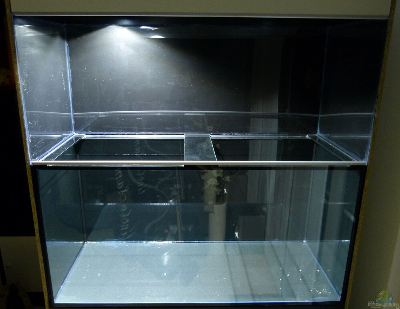 Als nächstes wurden Acrylglasplatten mit einer stärke von 2mm und einer Höhe von 50cm an die Seiten und Rückwände mittels Aquariumsilikon geklebt. Der Raum über den Acrylglasplatten dient für die Beleuchtung und ist ebenfalls mit einer Acrylglasplatte in 4mm Stärke vom Landteil getrennt. Somit kommt die Beleuchtung nicht mit Schwitzwasser oder Sonstigem in Kontakt. Obenauf liegt eine Spanplatte in wei?? in den Ma??en 124x55x0, 12cm.