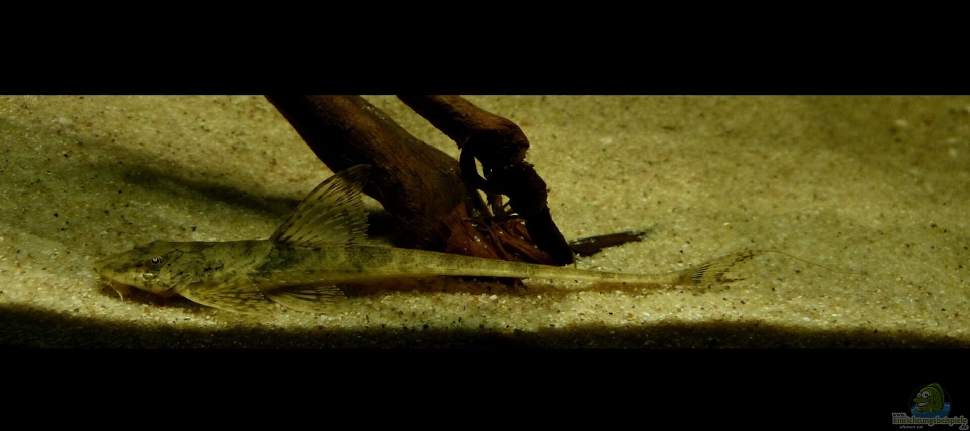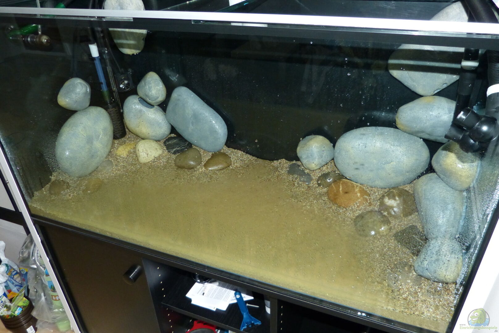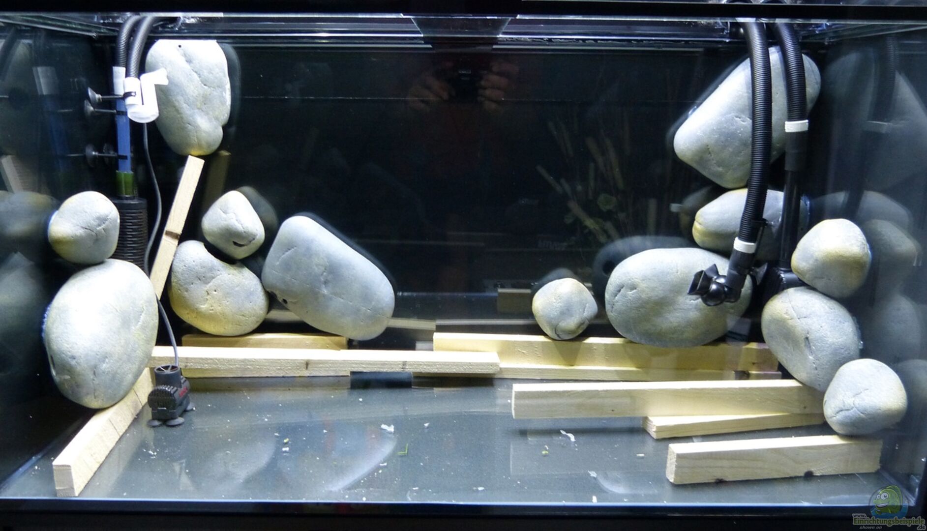 * bestehend aus schwarzer Rückwand hinter dem Becken und Aqua Della Steinen im Becken in Bodennähe an den Seitenwänden und der Rückwand verklebt. Die Steine sind Innen hohl und dienen Somit als Höhlen für die Ringelhandgarnelen und Welse.