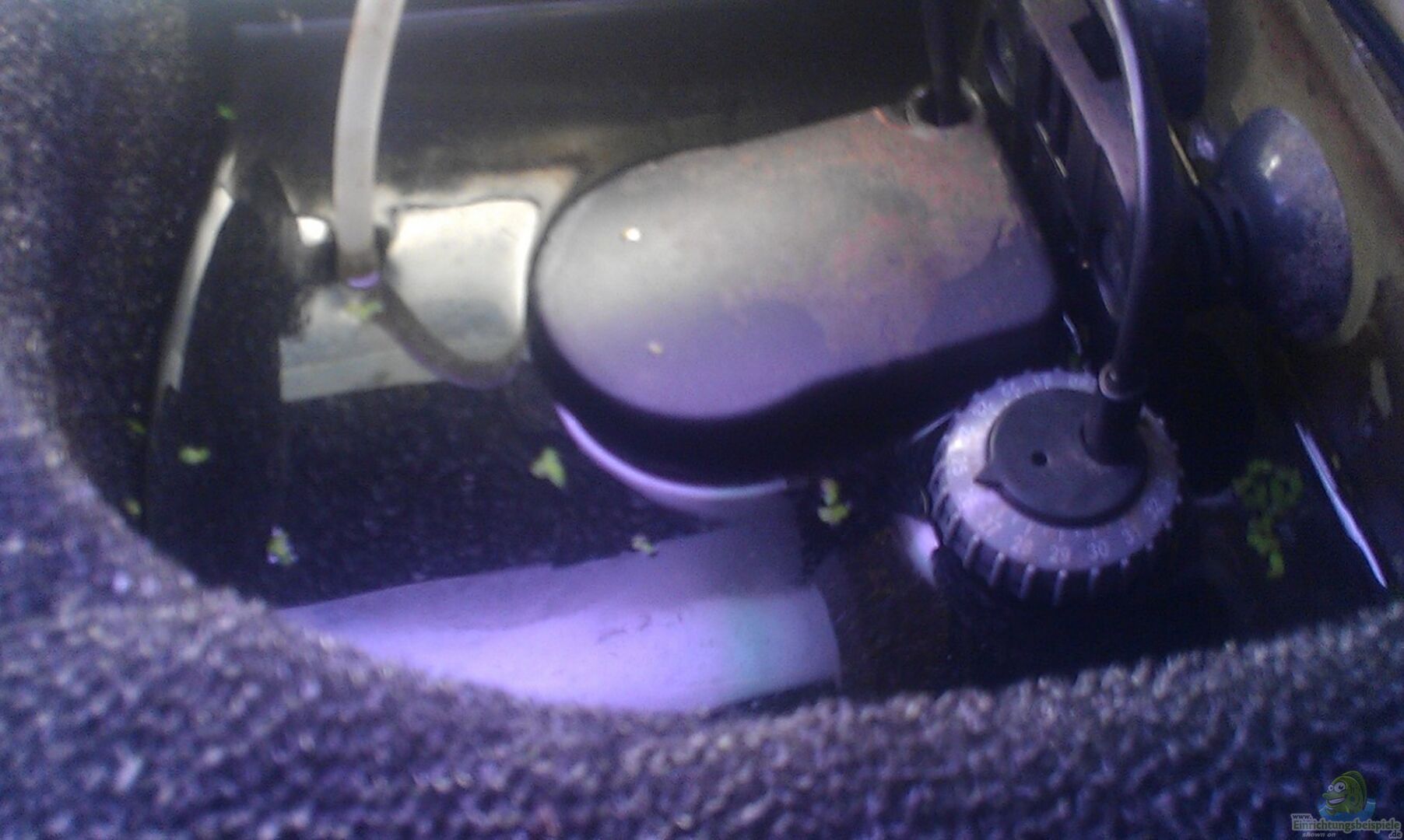 Ein Eck-HMF der in einem Plexiplasgehäuse ist und mit einer Pumpe von 1000L/ Stunde betrieben wird(Aquaelpumpe), sowie eine Filtermatte mit den Ma??en 55x30 aufweist. Die Matenstärke ist 30mm / PPI 20.