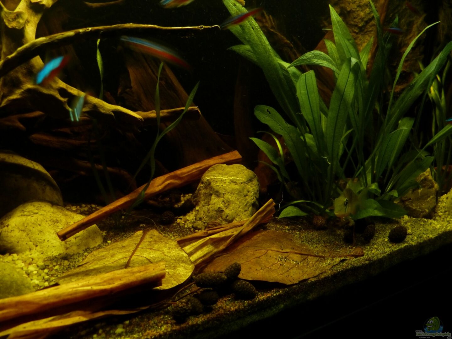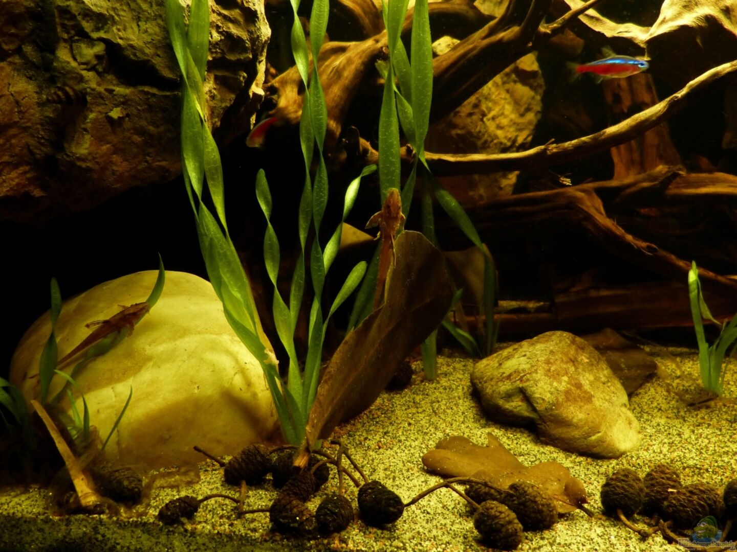 Wasser wird mit Easy-Life flüssiges Filtermedium und mit Amtra Eichenextrakt aufbereitet. Zudem bei jedem TWW getrocknete Seemandelbaumblätter, Bananenblätter, Eichenlaubblätter sowie Erlenzapfen.