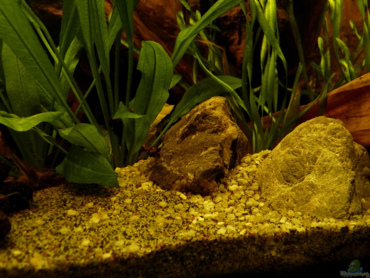 * beide Kiessorten miteinander vermischt um einen etwas dunkleren Ton zu treffen und um zu verhindern, dass der Bodengrund zu sehr reflektiert und das Becken dadurch zu hell wird.