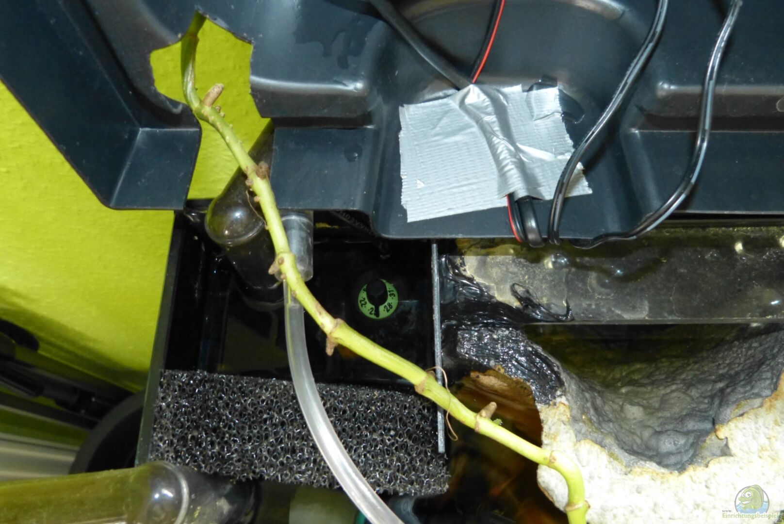 * Der Wasseransaugstutzen, der über eine sogenannte Sicherheitsbohrung ca. 3cm unter der Wasseroberfläche verfügt, befindet sich in einer selbstgeklebten "Vorfilterkammer" in der linken hinteren Ecke des Beckens. In dieser Kammer sitzt auch der Regelheizer.