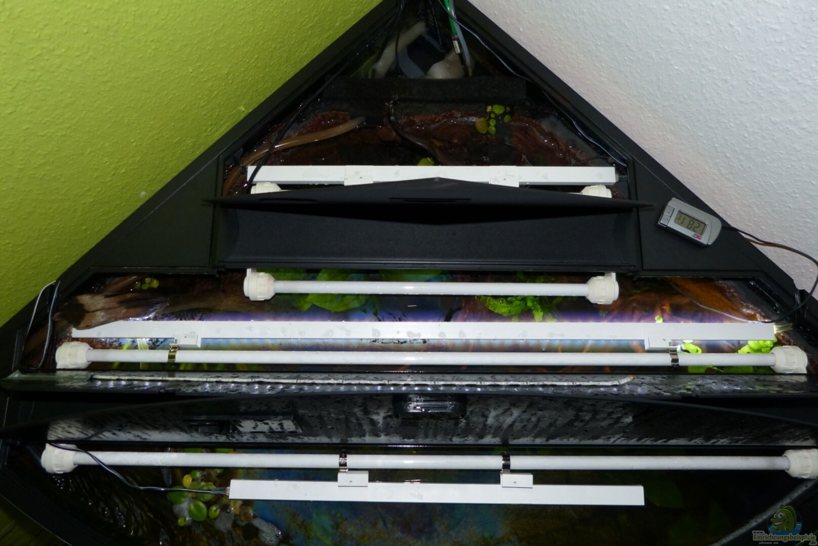 Die vorhandenen zwei T5 Leuchtbalken werden nicht mehr genutzt und wurden durch LED-Lichtleisten ersetzt. An den vorhandenen Leuchtstoffröhren wurden die LED-Lichtleisten angebracht/angeclipst.