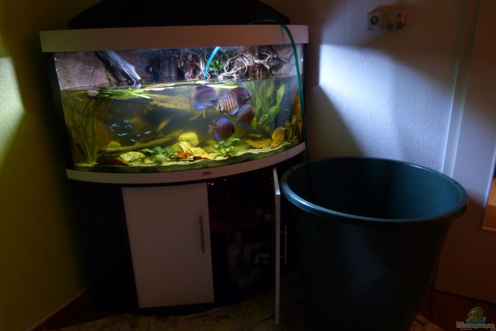 Das "Altwasser" wird mit einer Pumpe aus dem Becken direkt in die Regentonne gepumpt. Das "Frischwasser" wird in einer Regentonne, die nur zum TWW genutzt wird, aufbereitet und ebenfalls mit einer Pumpe ins Aquarium gepumpt.