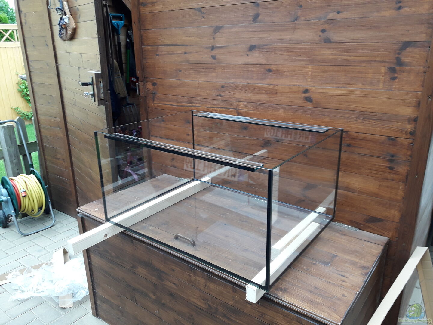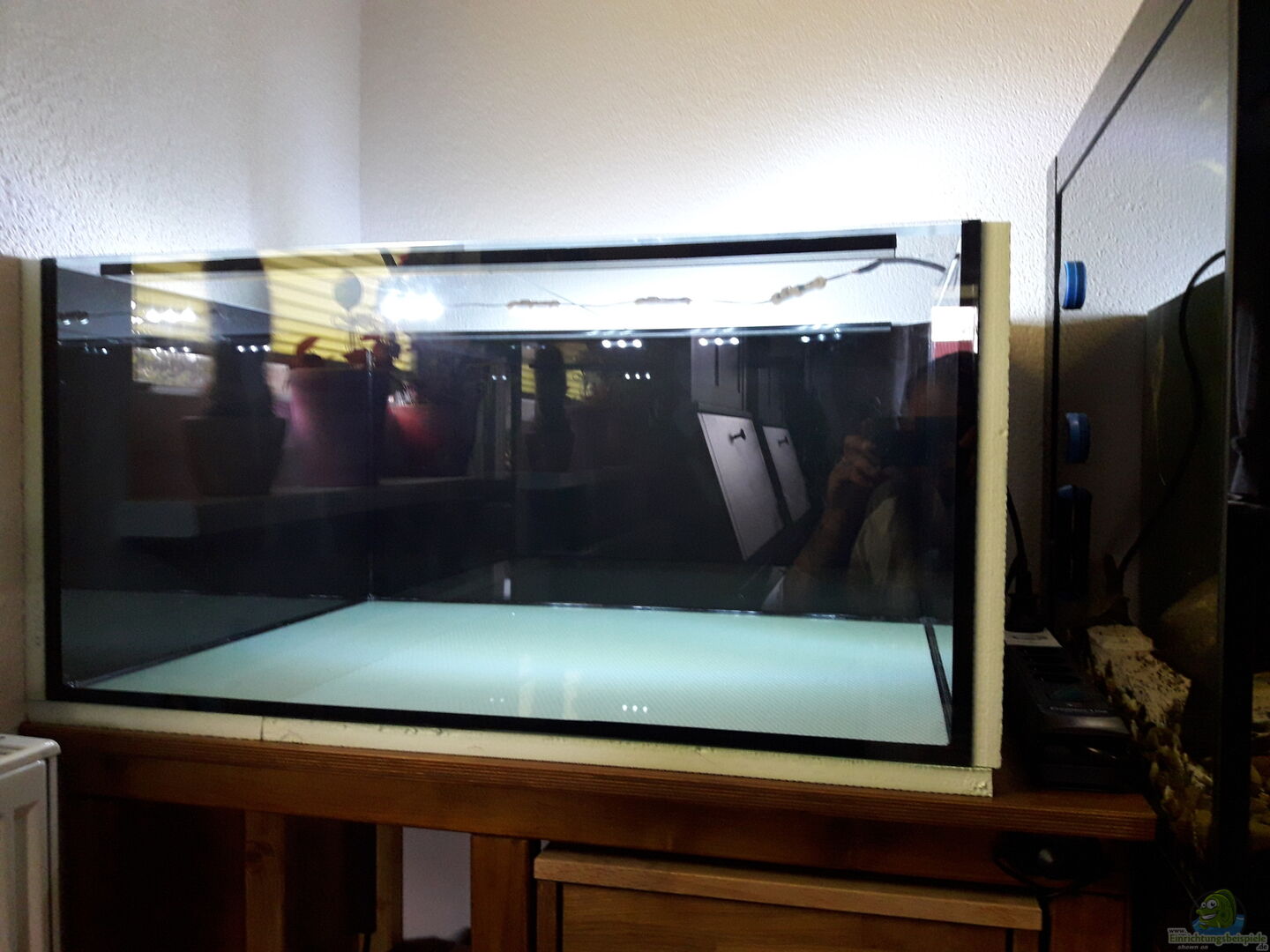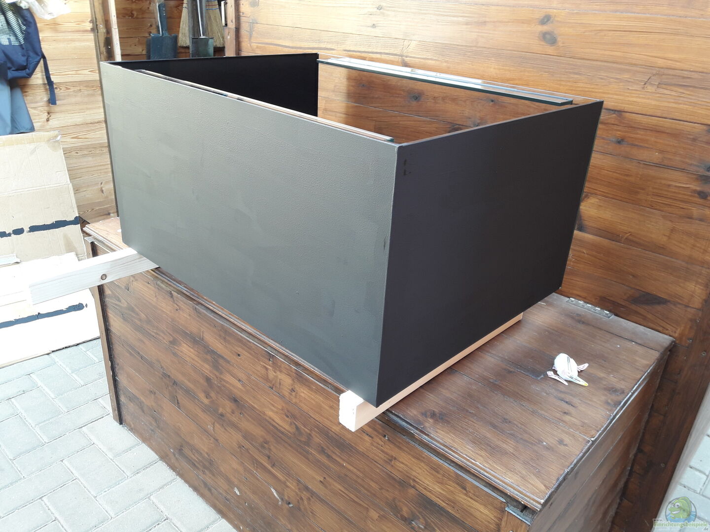 Das Becken ist eine Sonderanfertigung mit 8 mm Glasstärke und 2 Streben zur Auflage der Abdeckung. Den Unterbau habe ich aus Rahmenholz und einer Multiplexplatte selbst gebaut. Dieser steht auf 12 höhenverstellbaren Möbelfü??en, um jede Unebenheit im Fu??boden auszugleichen. Als Abdeckung dienen die alten Acrylglasplatten von meinem gro??en Becken, passend zugeschnitten. Das Becken ist von 4 Seiten mit 2 cm Styrodur gedämmt und Rück- sowie Seitenscheiben sind von au??en mit schwarzer Farbe angestrichen. Als Kies- und Wasserstandsblende sowie zum Verdecken der Dämmung dient schwarzes Acrylglas, welches mit doppelseitigem Klebeband angebracht ist.