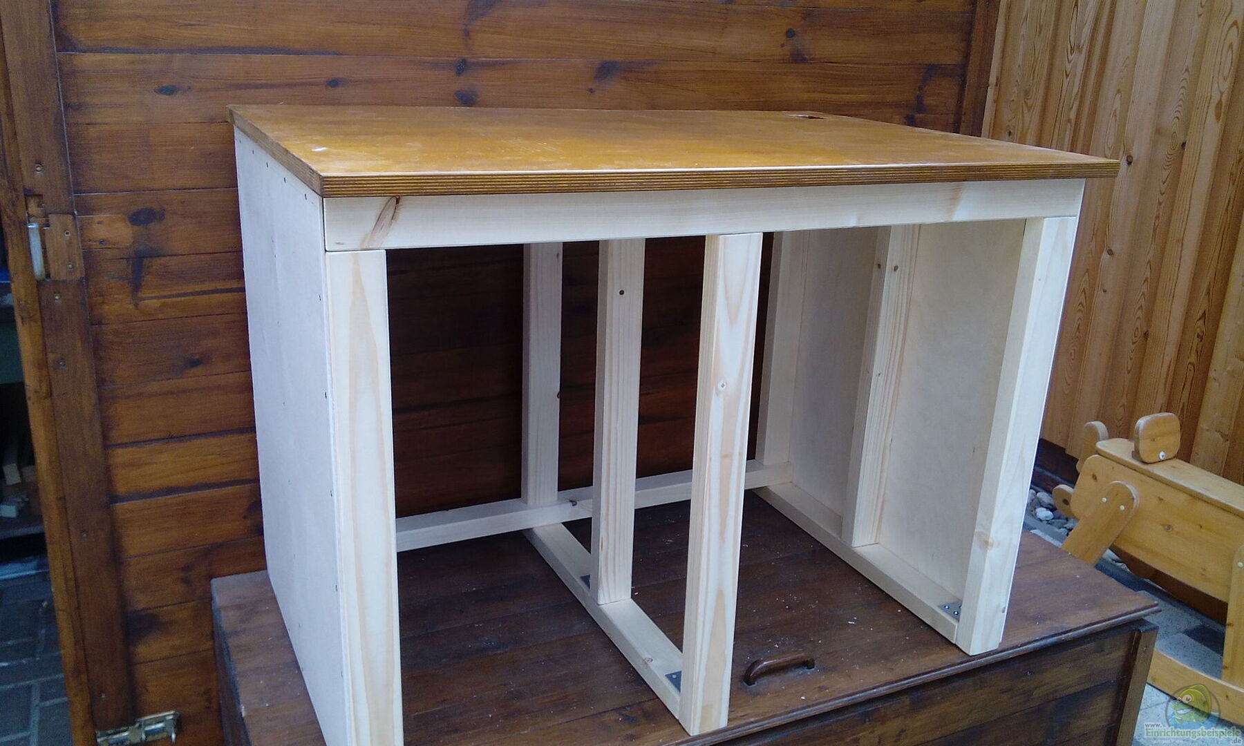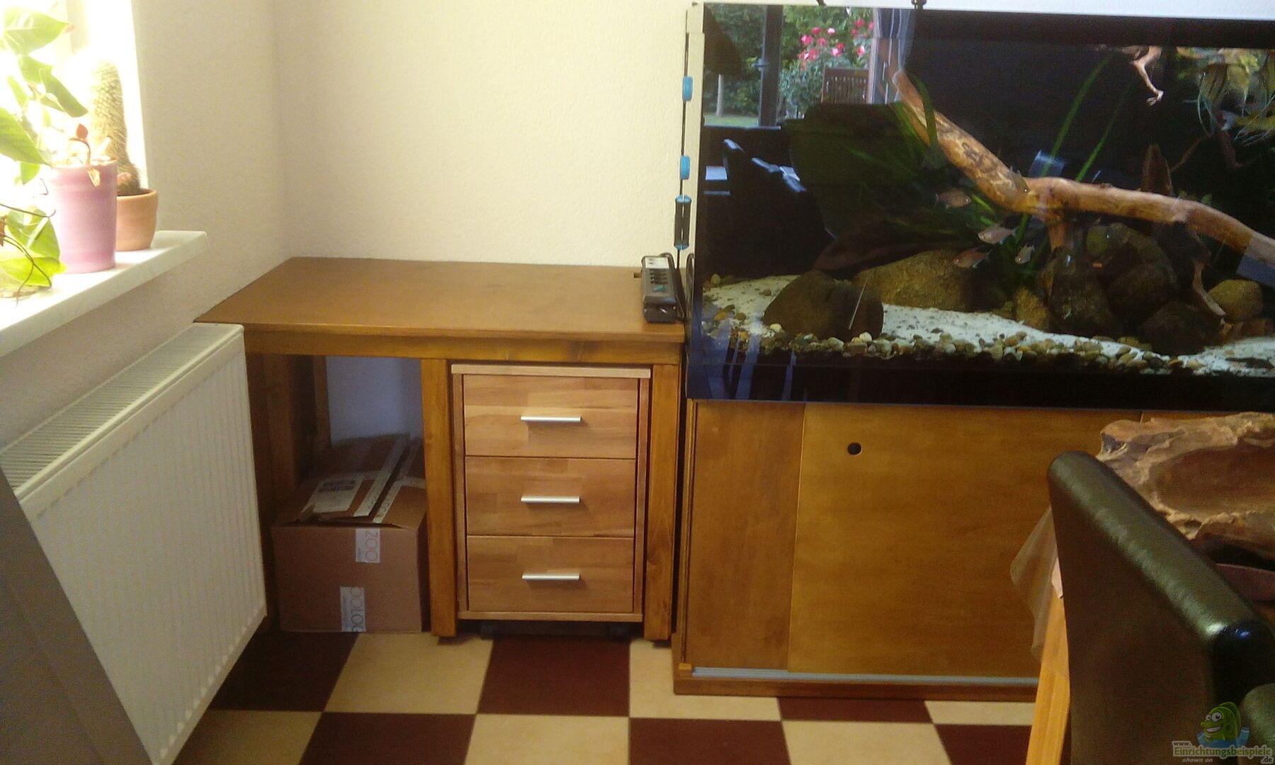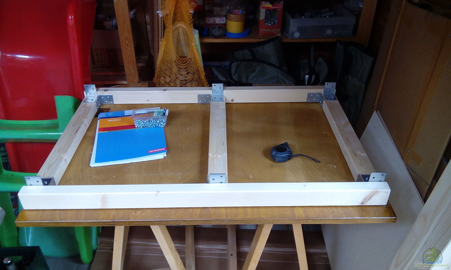 Das Becken ist eine Sonderanfertigung mit 8 mm Glasstärke und 2 Streben zur Auflage der Abdeckung. Den Unterbau habe ich aus Rahmenholz und einer Multiplexplatte selbst gebaut. Dieser steht auf 12 höhenverstellbaren Möbelfü??en, um jede Unebenheit im Fu??boden auszugleichen. Als Abdeckung dienen die alten Acrylglasplatten von meinem gro??en Becken, passend zugeschnitten. Das Becken ist von 4 Seiten mit 2 cm Styrodur gedämmt und Rück- sowie Seitenscheiben sind von au??en mit schwarzer Farbe angestrichen. Als Kies- und Wasserstandsblende sowie zum Verdecken der Dämmung dient schwarzes Acrylglas, welches mit doppelseitigem Klebeband angebracht ist.