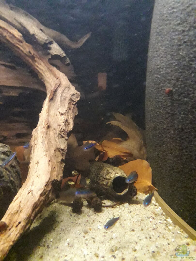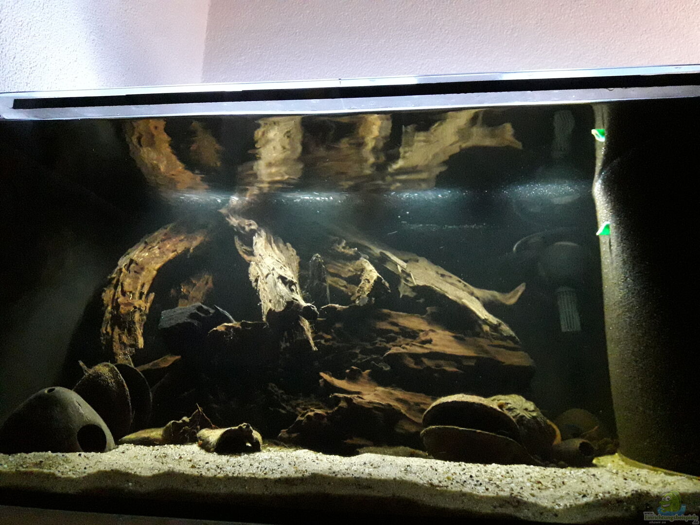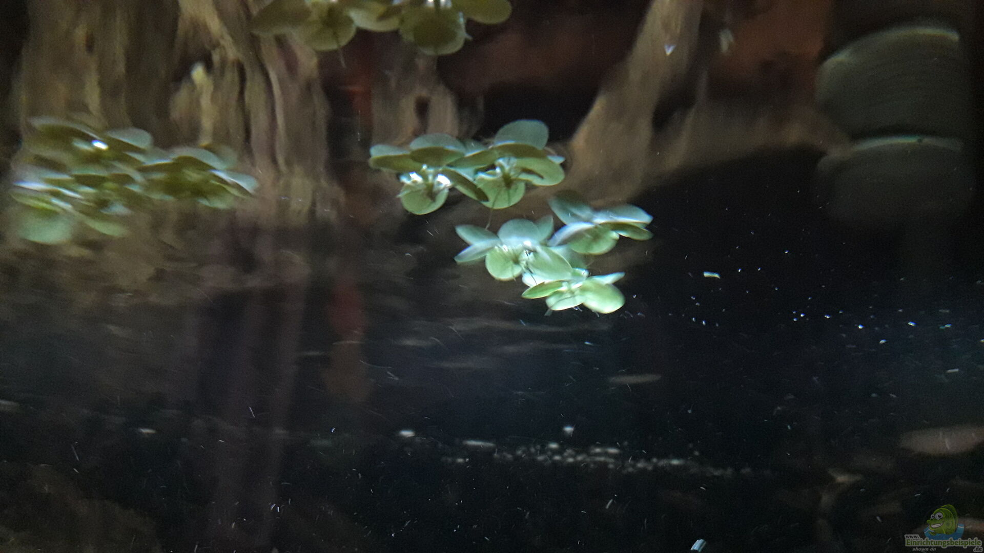 Wasserwechsel wöchentlich 1 bis 2 Drittel, je nach Leitwert. Aufbereitet wird mit Schwarztorf und Erlenzapfen.
