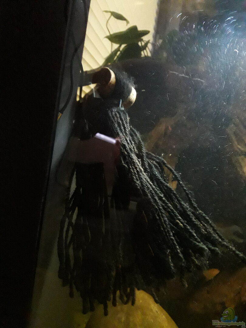 Gefiltert wird über einen Mattenfilter über die gesamte rechte Seitenscheibe. Dieser wird mit einer Sera proflow u500 betrieben.