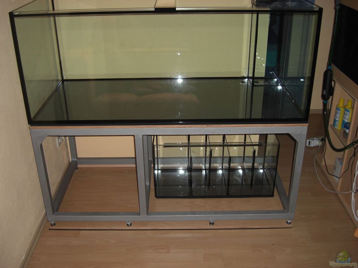 Auf dem Gestell liegt ebenfalls eine 15mm starke geölte Multiplexplatte. Um Unebenheiten auszugleichen und Spannungen im Aquariumglas zu verhindern, befindet sich eine 10mm starke Naturkautschukmatte darauf.