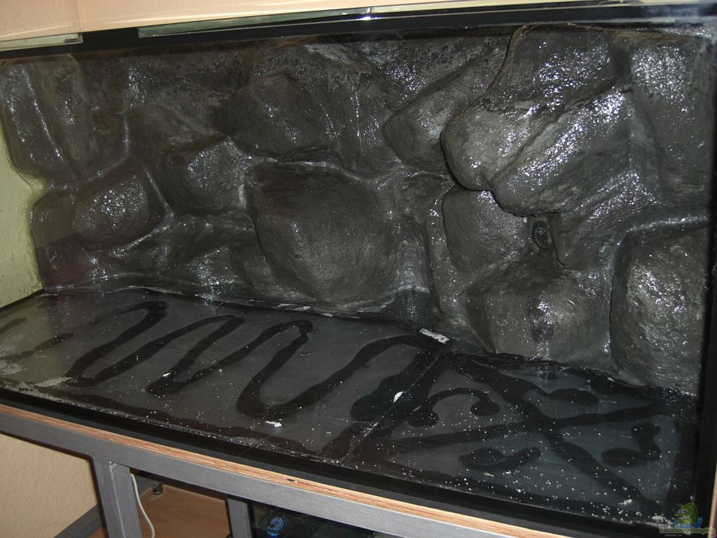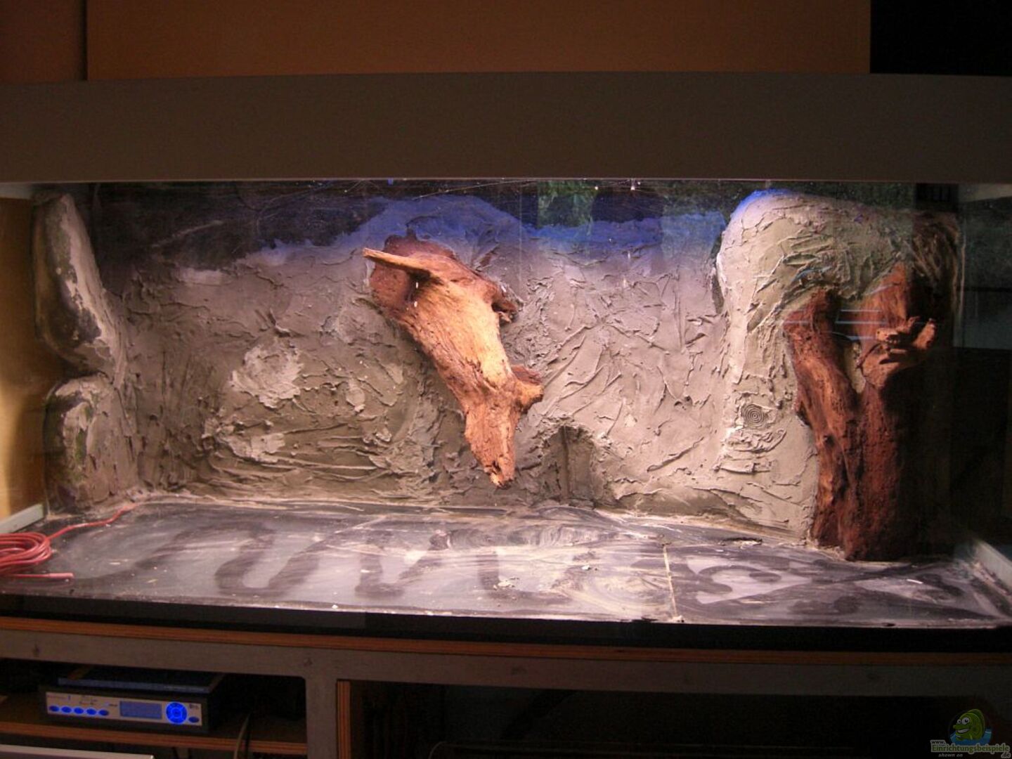 Eigenbau Rückwand aus PU-Schaum, Fliesen-Flexkleber, Fugenbunt (Anthrazit, Dunkelbraun), Epoxid-Harz für Aquarien, Sand und zwei mittelgro??e Mangrovenholzwurzeln welche in der Rückwand integriert sind. Das Kabel für den Bodenfluter ist in der Rückwand eingelassen, sodass es nicht sichtbar ist.