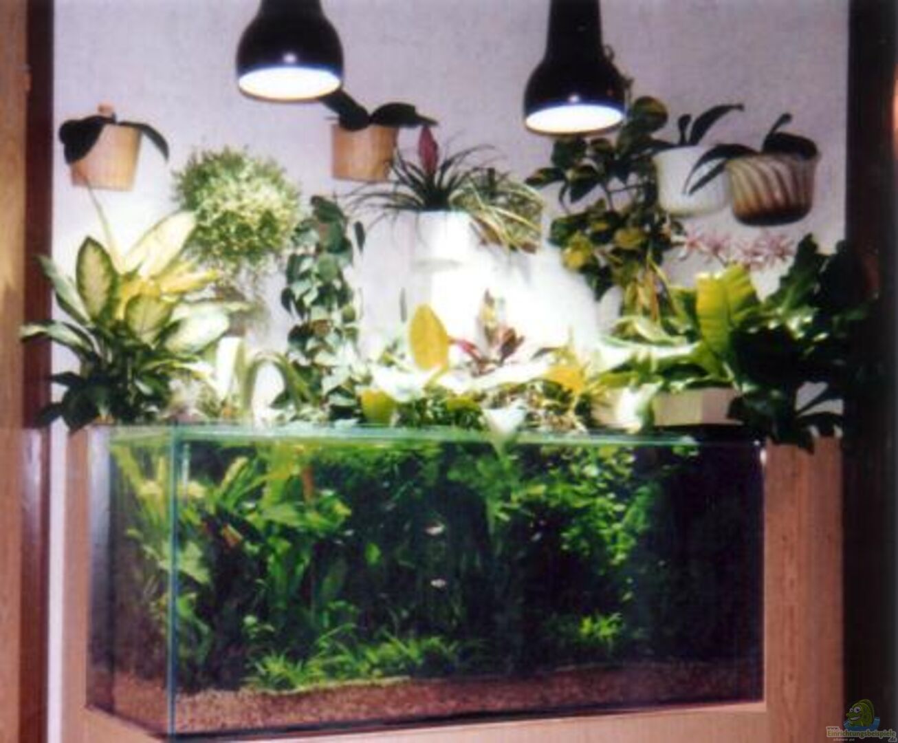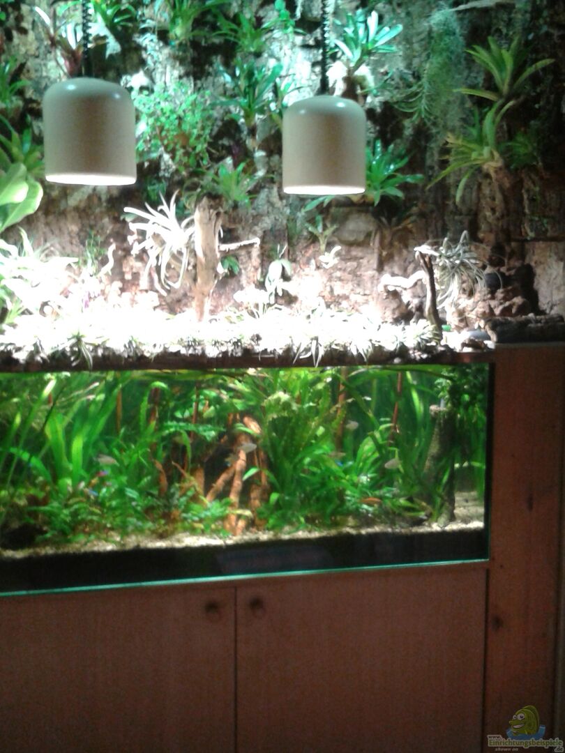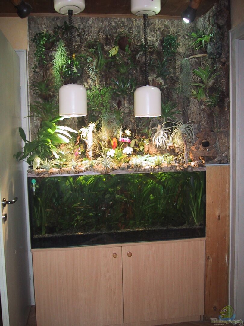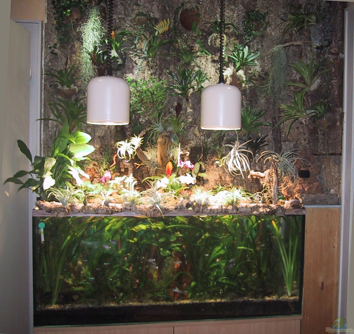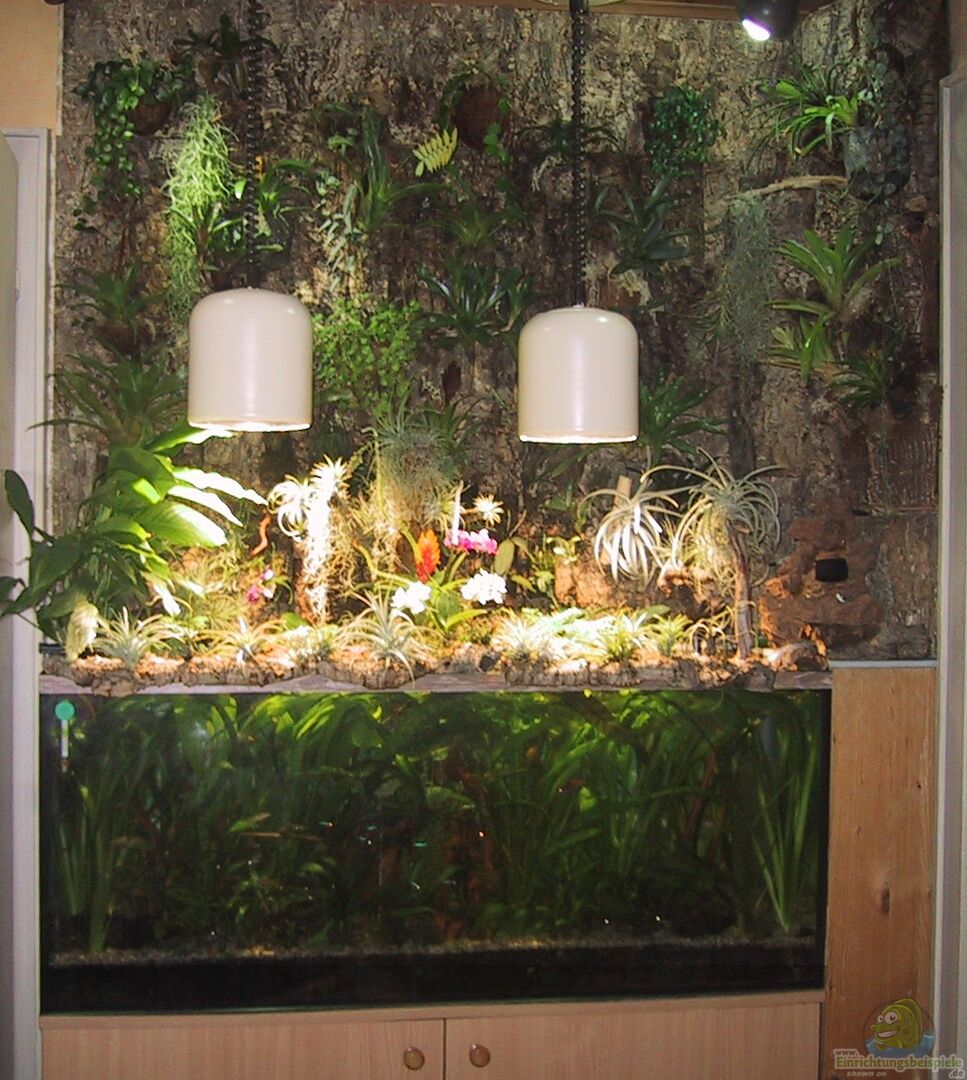 An den Wänden über dem Aquarium wurden Korkplatten, an denen Kokosnuss- und Paranussschalen als Pflanztöpfe mit Hei??kleber aufgebracht, in diesen die verschiedenen emersen Pflanzen getopft wurden.