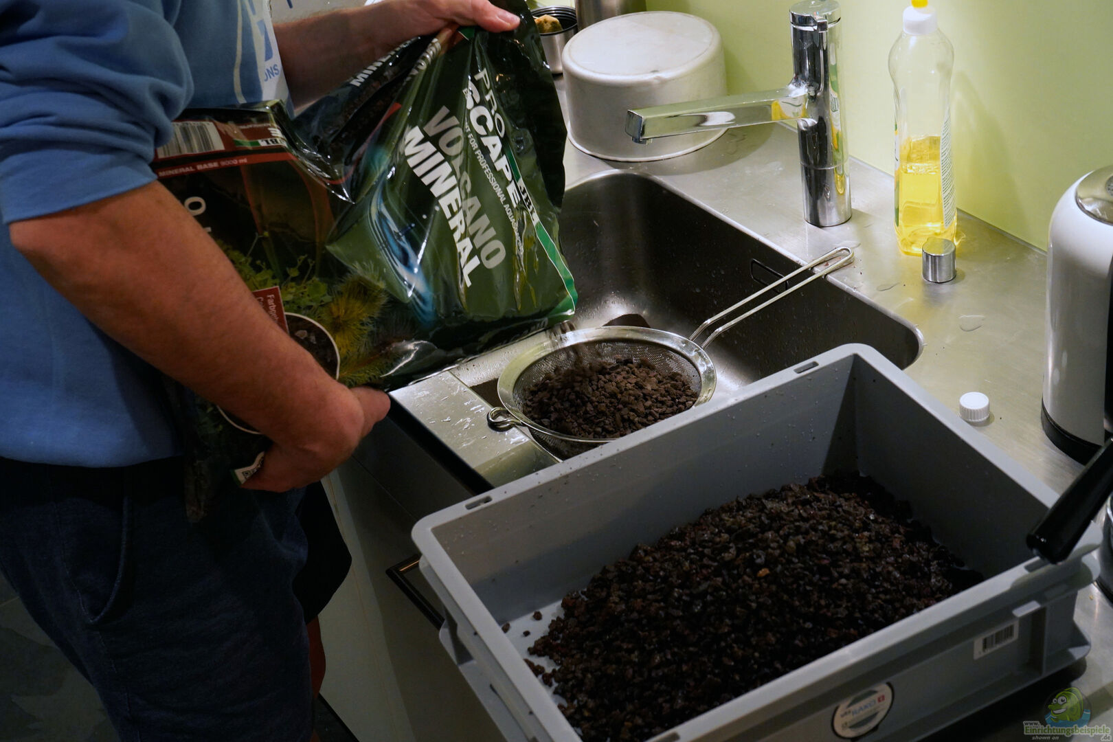 Der Bodengrund wurde mit JBL ProScape Volcano und ADA Amazonia Soil (Version 2) aufgebaut. Der helle Kies ist mit einer Korngrösse von 0.3 - 0.5mm angegeben. Es ist von JBL Sansibar River. Für das Becken mit diesem Aufbau verwendete ich