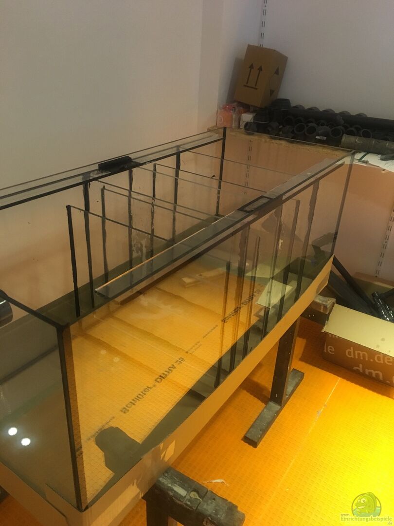 Ebenso habe ich gleich ein zusätzliches Becken 120cm x 50cm x 50cm (300 Liter) inkl. einer Bohrung in der Seitenwand mit bestellt, welches mir später als Technik Becken unter dem eigentlichen Aquarium dienen soll.