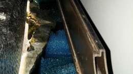 Die Rückwand wurde "dicht" eingeklebt. Zuvor habe ich drei Löcher am linken Rand für den Filtereinlauf gebohrt und hier runde braune Möbellüfter eingeklebt. Au??erdem natürlich ein Loch für den Filterauslauf. Ich nutze die EHEIM Aquarien Pumpe compact (300l/h) und habe den Filterauslauf unauffällig am oberen rechten Rand platziert. Durchführung mittels Schlauch und die Strömung mit einem Winkelstück angepasst.