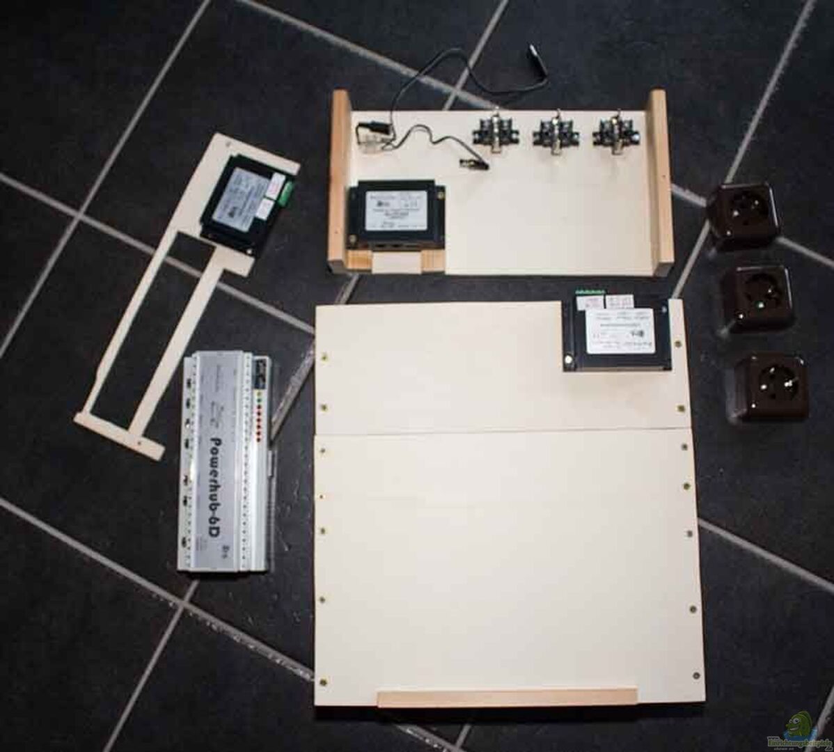 Darüber wurde ein dreiteiliges Regal angebracht, welches wir selbst gebaut haben. Das Regal dient nicht nur als Ablage für Dekorationsgegenstände, sondern auch, um darunter die Beleuchtung für das Becken anzubringen, sowie die Stromversorgung /-verteilung für zusätzliche Verbraucher (wie z.B. Strömungspumpen/ Futterautomat). Der Strom wird aus dem Unterschrank vom PowerHub 6D PAB nach oben geleitet und ist somit je Steckdose steuerbar!