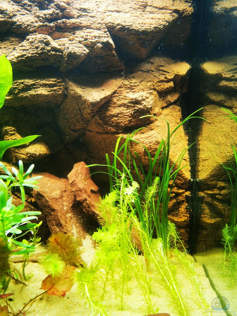 Natürlich Wurzeln und ein paar Steine um unschöne Strömungslöcher im Sand und den Ansaugbereich zu kaschieren. Dazu kommt die wunderschöne Back to nature-Rückwand, die ich nach rund 10 Jahren Trockenheit und Schrumpfung neu mit Silikon verkleben musste - dieses Mal aber schwarzes Silikon, das durchsichtige ist doch sehr unschon veralgt mit der Zeit.