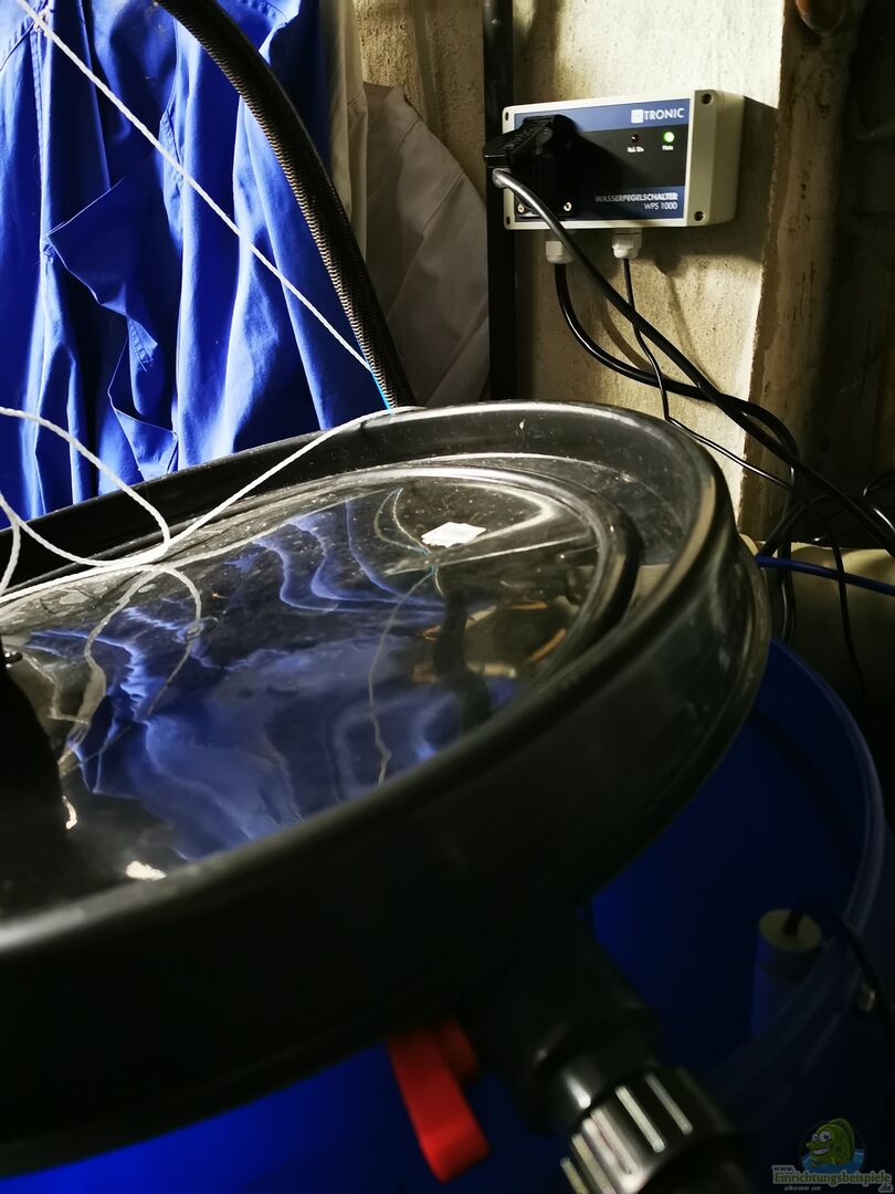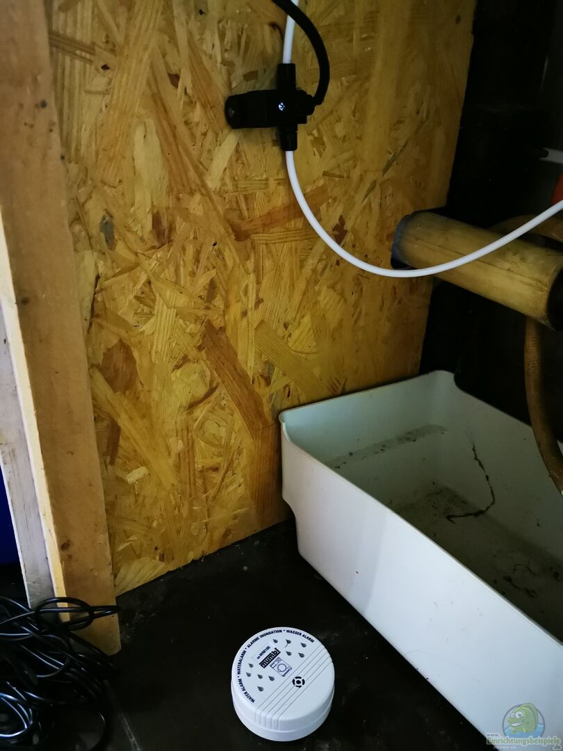 Osmoseanlage mit ??berfüllungsschutz/Wasserwechsel: Das für den Wasserwechsel vorgesehene Wasser erzeuge ich im Keller über eine Osmoseanlage. Ein Pegelschalter steuert Stromzufuhr zu einem Magnetventil im Zufluss der Osmoseanlage. Zusätzlich sorgt ein batteriebetriebener Wasserwarner für etwas mehr Sicherheit. Vom Keller wurde ein neu erworbener 3/4 Zoll-Schlauch in das OG verlegt. Im Keller wurde ein 3-Wege-Hahn eingebaut und mit Edelstahlschlauchschellen gesichert. Ein Ende führt zum Fass, das andere Ende wurde über den Waschmaschinenanschluss mit Schellen gesichert zum Ablauf geführt. Eine ebenfalls neu und nur zu diesem Zweck verwendete Tauchpumpe kann nun in das Fass gesenkt werden. ??ber eine mit dem WLAN-verbundene Steckdose kann die Tauchpumpe an- und abgeschaltet werden. Nach einem kurzen Anpumpen wird einfach am 3-Wege-Hahn umgeschaltet und das Aquariumwasser von dem im Schlauch zurückfallenden Pumpwasser angesaugt. So wird das Becken innerhalb kürzester Zeit ganz ohne Pumpleistung teilgeleert. Dann wird erneut umgestellt und die Pumpe angeworfen. Das aus dem Fass gepumpte und mittels Stabheizern über Nacht vorgewärmte Wasser strömt in das Becken. Dank der WLAN-Steckdose kann man neben dem Becken stehend genau justieren wie hoch der Wasserstand sein soll. Dann wird das Schlauchende aus dem Wasser gehoben und der Schlauch im Keller geleert. Noch erfolgt das in den Abwasserzweig, ich habe jedoch eine EHEIM-Doppelhahn-Schnellkupplung bestellt um dies zukünftig zurück in das Fass erfolgen zu lassen - wäre schade darum!